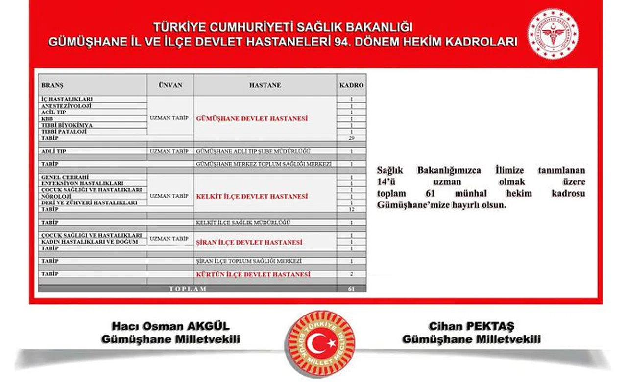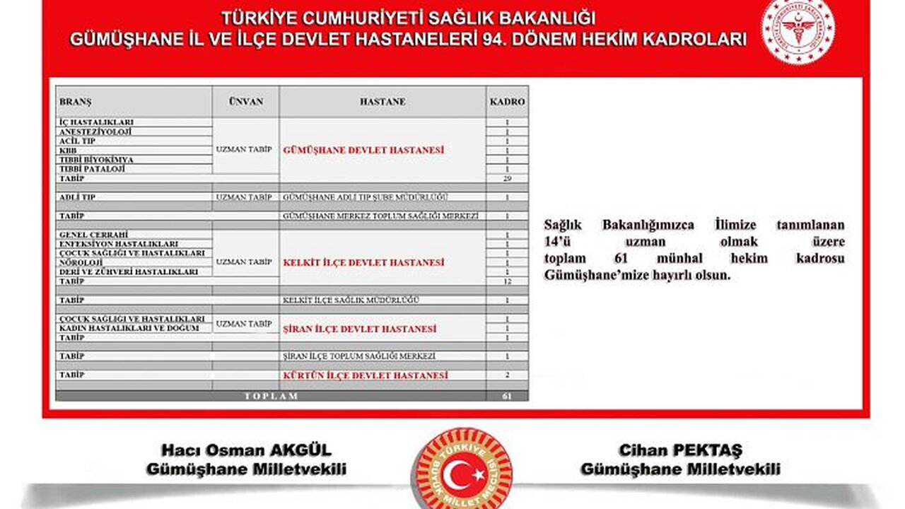 Kura ile Gümüşhane Adli Tıp Şube Müdürlüğüne 1 adli tabip, Gümüşhane Devlet Hastanesine 29 pratisyen, 1 Acil Tıp Uzmanı, 1 Anesteziyoloji ve Reanimasyon Uzmanı, 1 İç Hastalıklar Uzmanı, 1 Kulak Burun Boğaz Uzmanı, 1 Tıbbi Biyokimya Uzmanı, 1 Tıbbi Pataloji Uzmanı, Gümüşhane Merkez Toplum Sağlığı Merkezine 1 pratisyen, Kelkit İlçe Sağlık Müdürlüğüne 1 pratisyen, Kelkit Devlet Hastanesine 12 pratisyen, 1 Çocuk Sağlığı ve Hastalıkları Uzmanı, 1 Deri ve Zührevi Hastalıkları Uzmanı, 1 Enfeksiyon Hastalıkları uzmanı, 1 Genel Cerrah, 1 Nöroloji Uzmanı, Şiran Devlet Hastanesine 1 Çocuk Sağlığı ve Hastalıkları Uzmanı, 1 Kadın Hastalıkları ve Doğum Uzmanı, 1 pratisyen, Kürtün İlçe Devlet Hastanesine 2 pratisyen ve Şiran Toplum Sağlığı Merkezine 1 pratisyen hekim olmak üzere toplam 61 doktor ataması gerçekleştirildi.