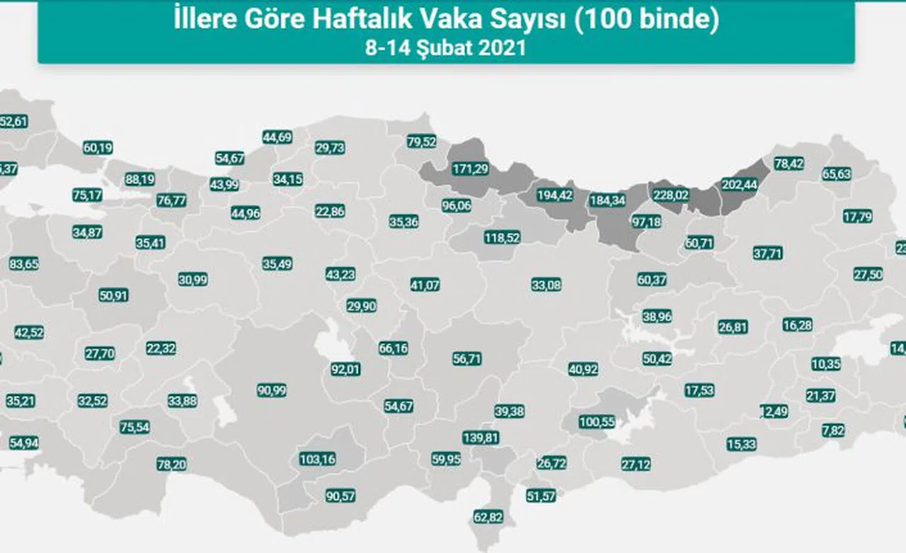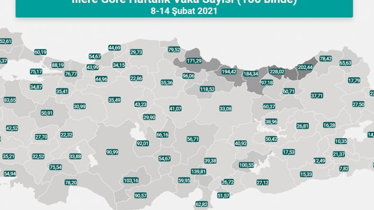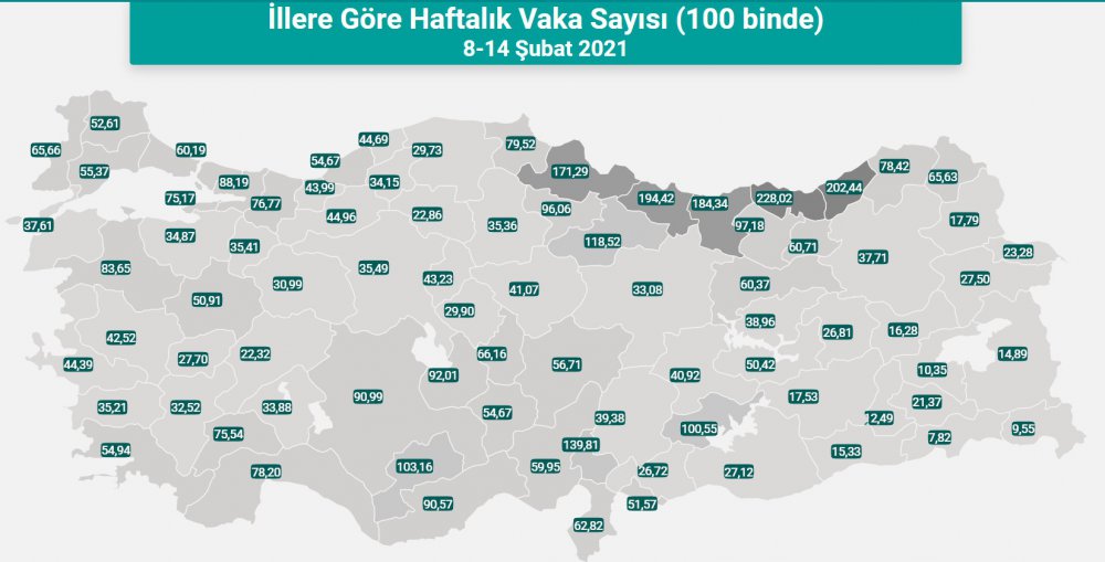 Haritaya göre 8-14 Şubat tarihleri arasında 100 bin kişide vaka sayısı Gümüşhane'de 97,18 olarak ilan edildi. Doğu Karadeniz Bölgesindeki illerden Trabzon 100 bin kişide 228,02 ile ilk sırada yer alırken onu 202,44 vaka ile Rize, 194,42 vaka ile Ordu, 184,34 vaka ile Giresun, 171,29 vaka ile Samsun izledi.