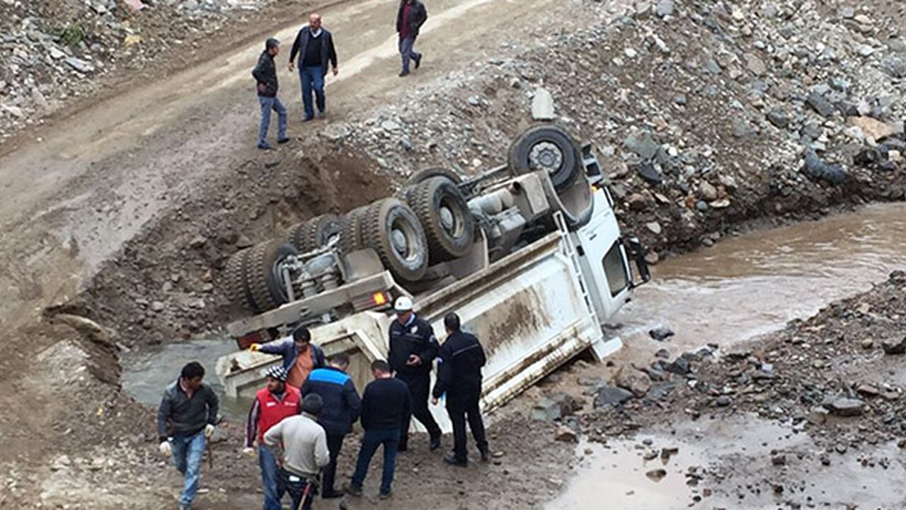 Edinilen bilgiye göre Harşit Çayı dere yatağında yürütülen dere ıslahı çalışmaları kapsamında yüklediği hafriyatla ana yola çıkmak isteyen plaka ve sürücüsü belirlenemeyen kamyon dere yatağından geçerken yolun kayması sonucu Harşit Çayına devrildi.
