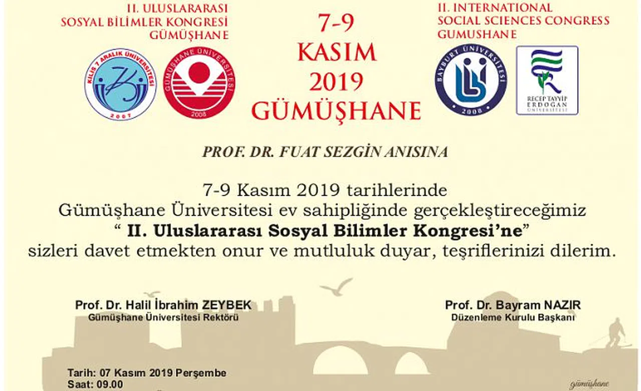 İlki 13-15 Mart 2019 tarihleri arasında Gümüşhane Üniversitesi ve Kilis 7 Aralık Üniversitesi işbirliğiyle Mersin’de düzenlenen Uluslararası Sosyal Bilimler Kongresi’nin ikincisi 7 Kasım Perşembe günü Kongre Merkezinde yapılacak açılış töreniyle Gümüşhane’de başlayacak.