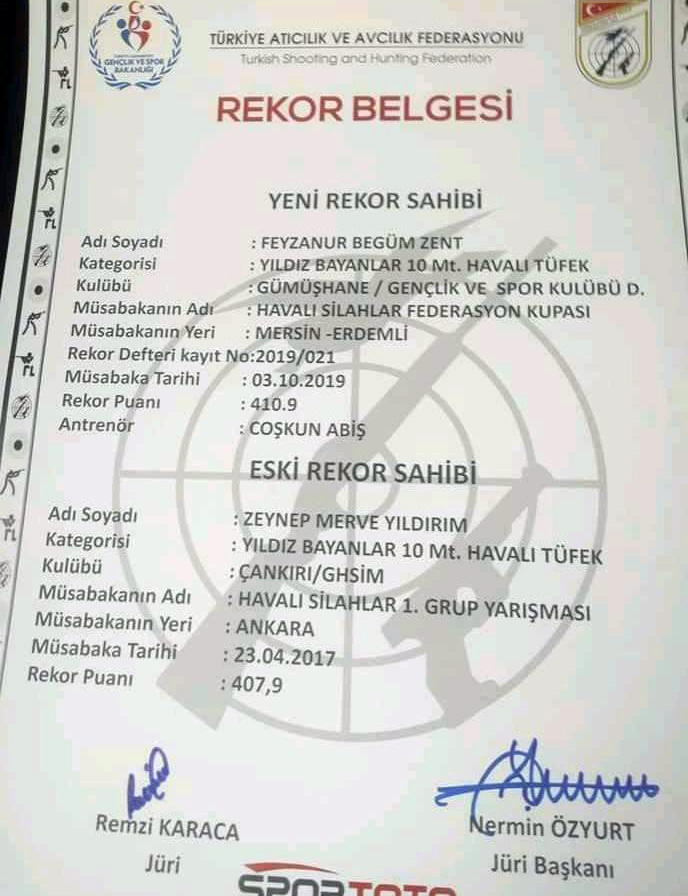 Yıldız Bayanlar 10 metre havalı tüfek müsabakalarında atış yapan Feyzanur Begüm Zent, 410,9 puan atarak yeni Türkiye rekorunun sahibi oldu. Bir önceki rekor 23 Nisan 2017 tarihinde 407,9 puanla Çankırı sporcusu Zeynep Merve Yıldırım'a aitti.