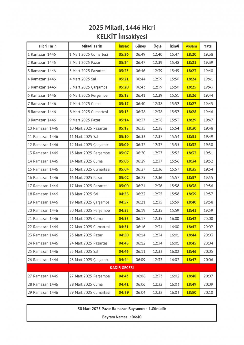 Ramazan Bayramı ise Gümüşhane il merkezinde 30 Mart Pazar günü 06.40’ta kılınacak.
