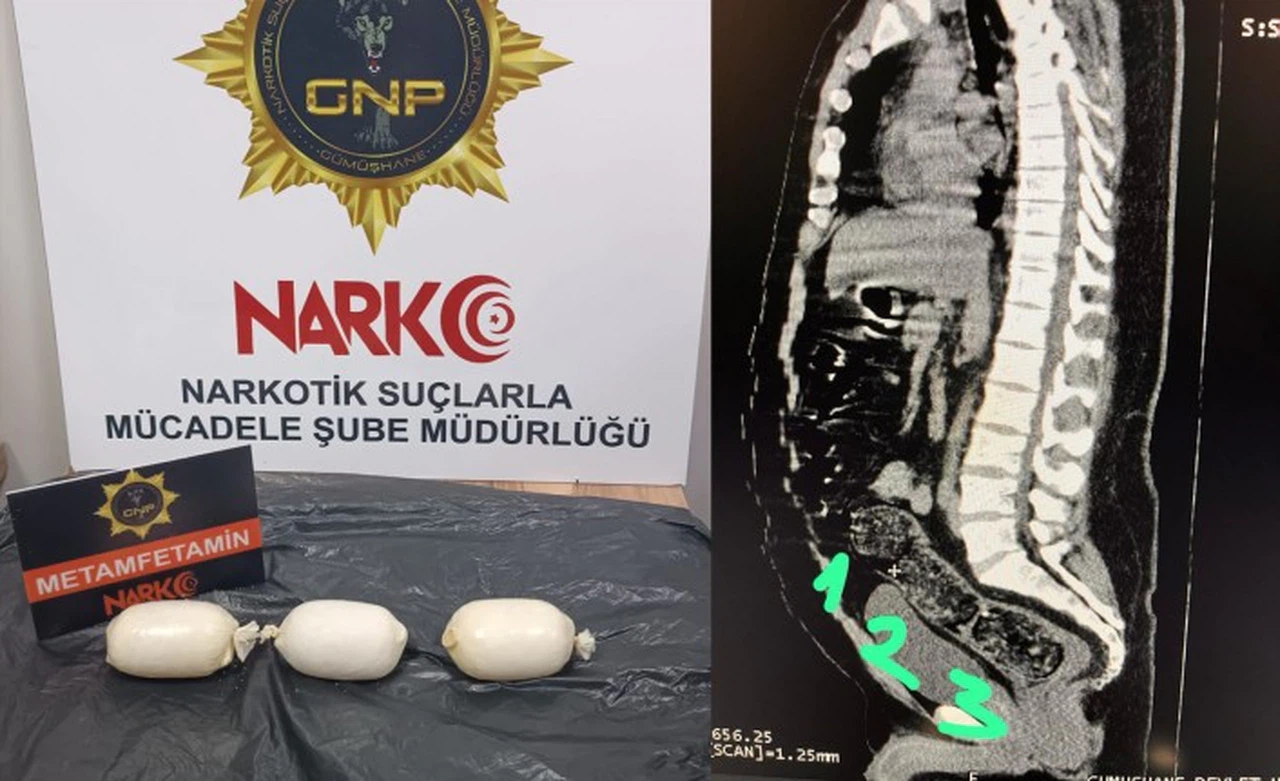 Gümüşhane’de Emniyet güçleri İran uyruklu şahsın bağırsaklarında 3 kapsül halinde 271, 55 gram metamfetamin maddesi ele geçirdi.