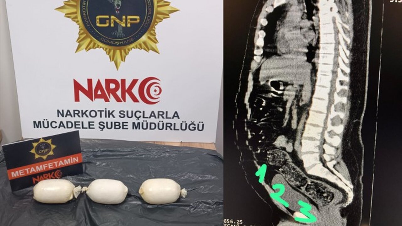 Adli makamlardan alınan talimat doğrultusunda Gümüşhane Devlet Hastanesinde çekilen röntgen filmlerinde ve yaptırılan iç beden muayenesinde şahsın bağırsaklarında 3 adet kapsül halinde 271,55 gram metamfetamin maddesi bulunduğu tespit edildi.