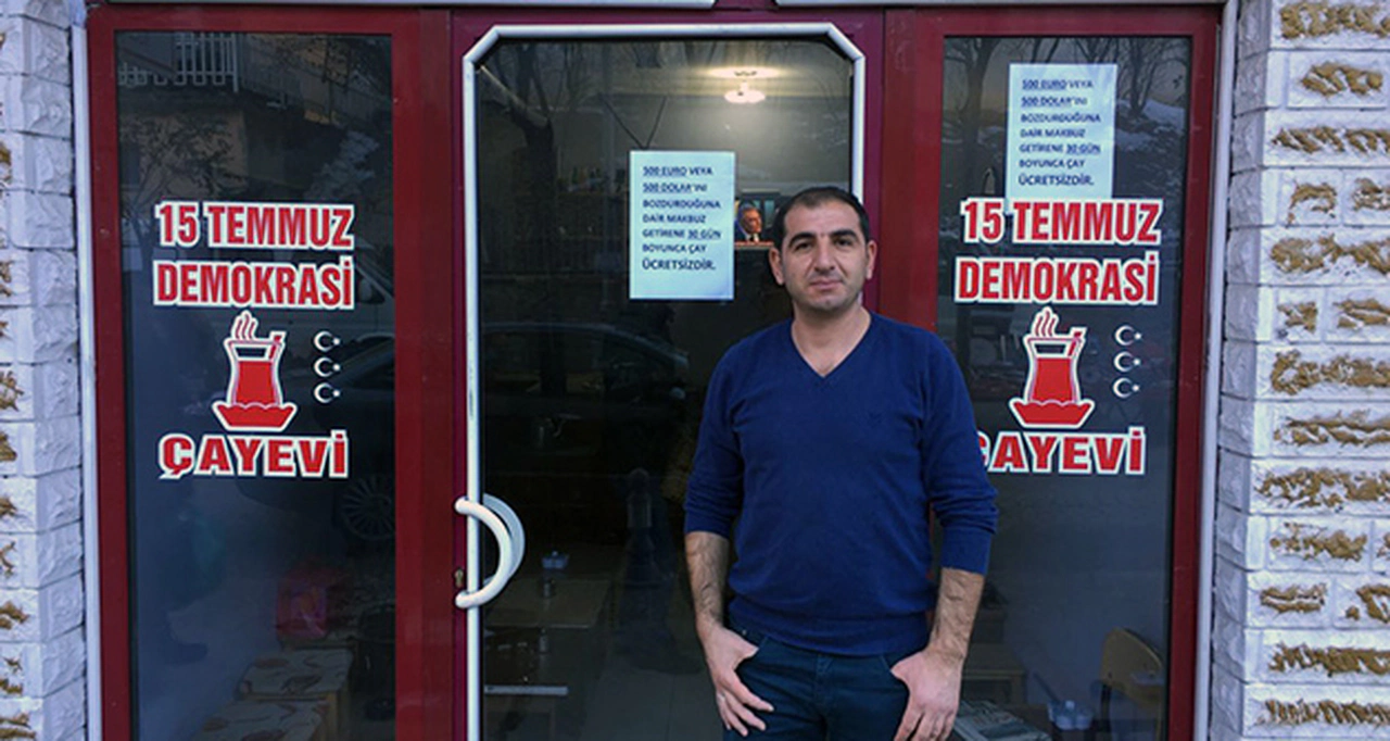 “500 euro veya 500 dolarını bozdurduğuna dair makbuz getirene 30 gün boyunca çay ücretsizdir” şeklindeki yazı ile kampanyayı vatandaşa duyuran 15 Temmuz Demokrasi Çayevi sahibi Sinan Ergün Cumhurbaşkanı Recep Tayyip Erdoğan’ın çağrısına destek vermek için böyle bir uygulamayı başlattıklarını söyledi.