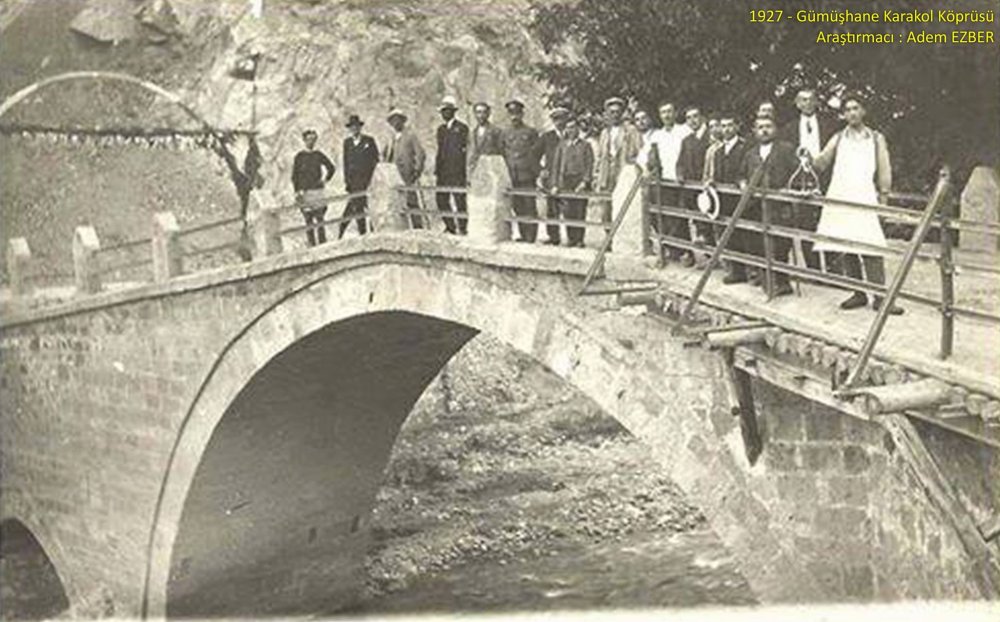 Köprü ile ilgili 1927 yılındaki fotoğrafı ortaya koyan Araştırmacı Adem Ezber, fotoğraf ile ilgili yazısında şunları kaydetti; “Yıl 1927, belli ki yeni kurulan Gümüşhane’ye giriş kapısı olarak kabul edilen bu köprü üzerinde süslemeler yapılmış, karşılama heyeti misafirlerini bekliyorlar. Bekleyenler yorulmuş olmalı ki genç bir çaycı, otlu Gümüşhane çayından bir fasıl geçiyor oradakilere. Köprünün sağ taraftaki çıkışı dar olsa gerek ek bir takviye ile doğal akışı olan sağa meyilli genişletme yapılmış. Köprünün eğimi dikkatimizi çeken diğer özelliklerden birisi. Yaz meysimi olsa gerek Harşit sükunet içerisinde köprünün kitabesindeki duaya iştirak etmiş gibi köprüyü susuz bırakmayarak o da misafirlerini beklemekte. Güneş Kuşakkaya sırtlarından doğmuş mezire üstlerinde, ısıtıp aydınlatıyor Hemşehrilerimizi. Burası Gümüşhane.”