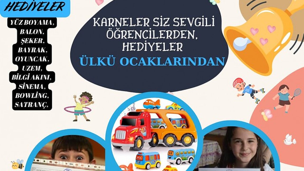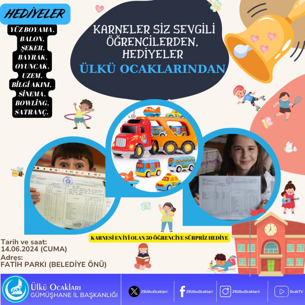 Fatih Parkında cuma günü düzenleyecekleri programla 10.00-17.00 saatleri arasında karneleriyle gelen tüm öğrencilere çeşitli hediyeler vereceklerini kaydeden Coşkun, "Karnelerini alan öğrenci kardeşlerimizin sevinçlerine ortak olmak istedik. Bu nedenle karnesiyle gelen öğrencilere çeşitli hediyeler, sürpriz oyuncaklar vereceğiz. Ayrıca Ülkü Ocakları Eğitim ve Kültür Vakfı Genel Merkezimizin hazırladığı Türk büyükleri okuma kitapları, bilgi akını, Odak 2023 yazılımı ve yüz boyama gibi hediyelerimiz var" dedi.