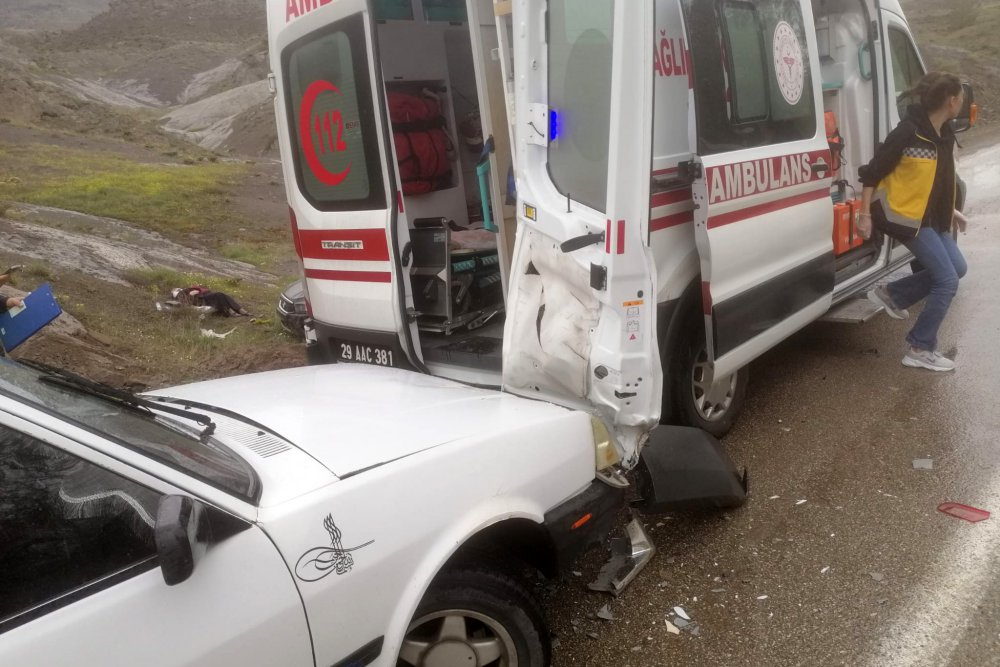 Otomobil ambulansa arkadan çarparken yaralılara müdahale etmek için ambulansın arka kapısından malzemeleri alan sağlık görevlileri saniyelerle kazadan kurtuldu.
