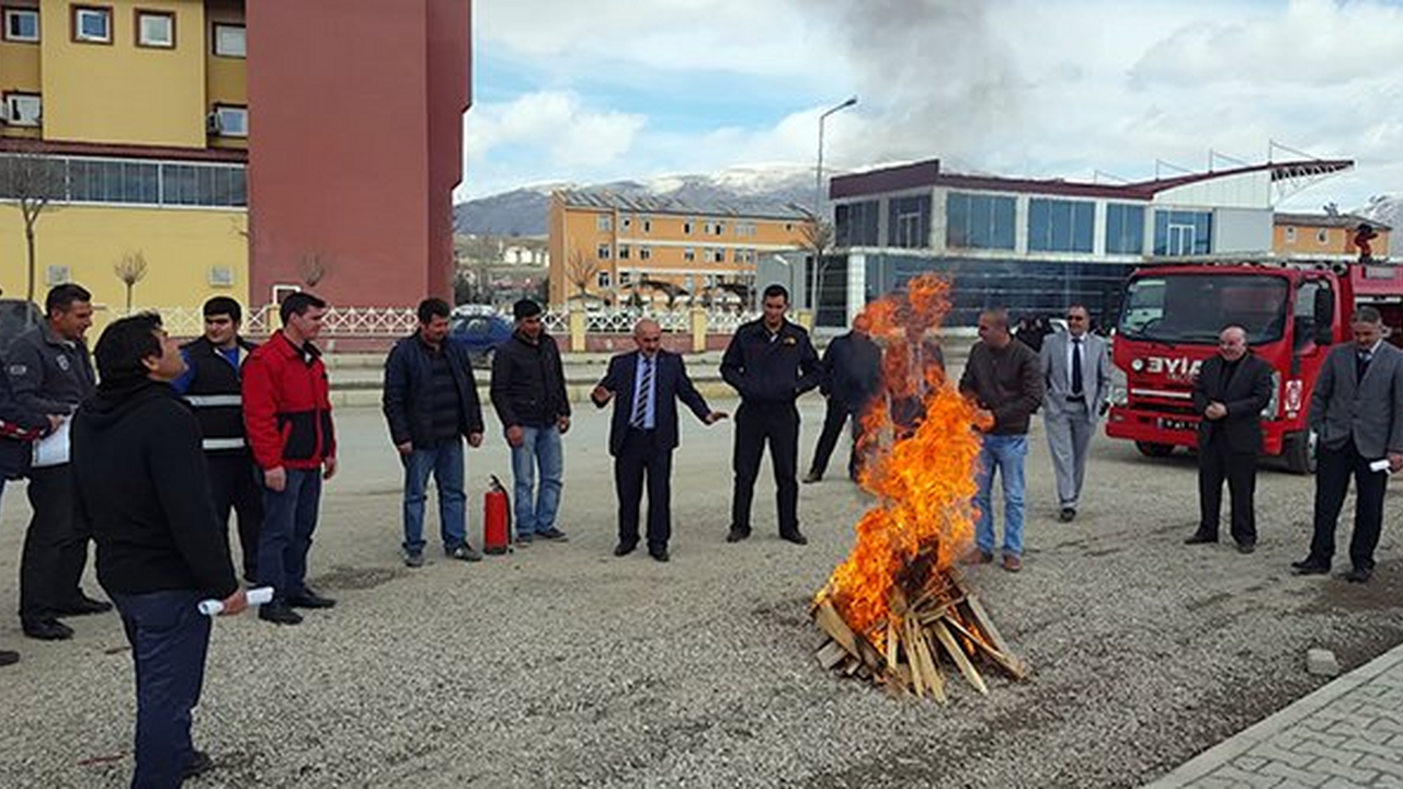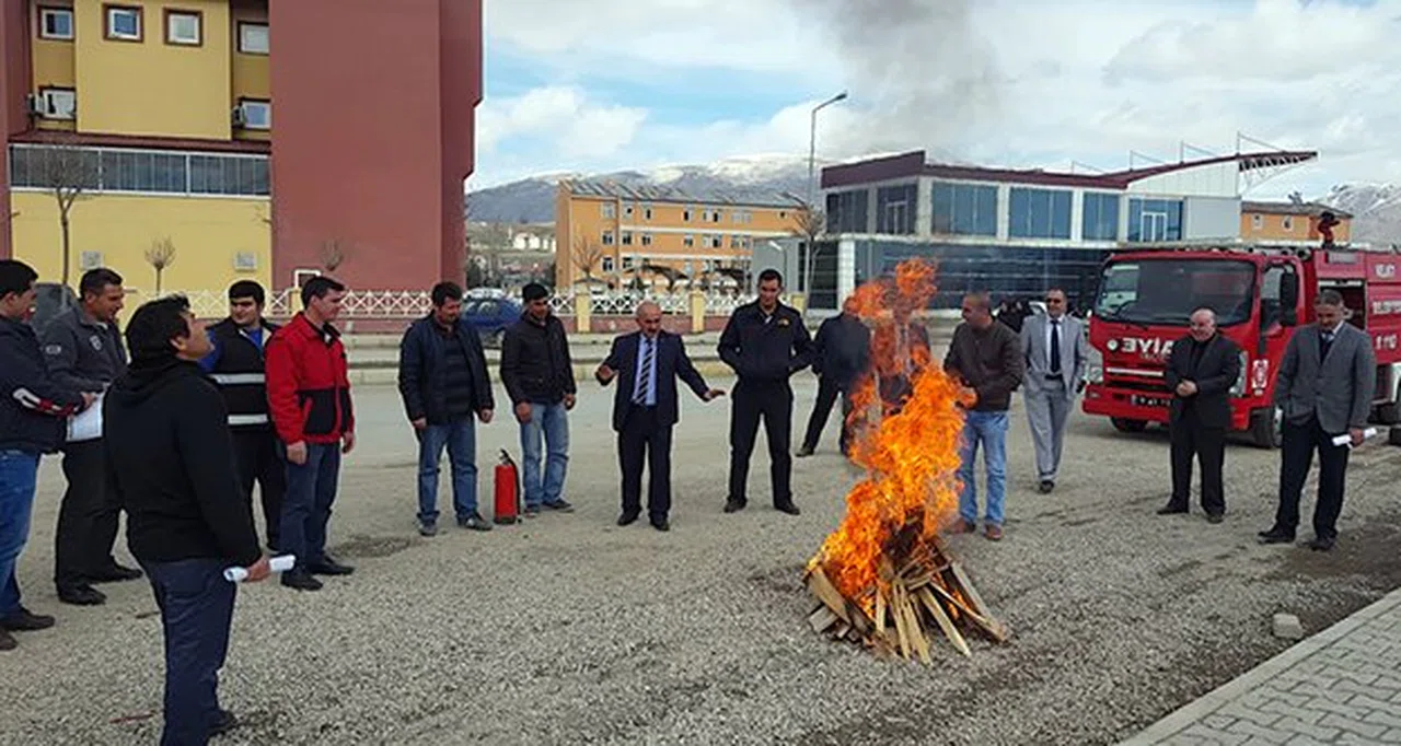 Kaymakamlık bahçesinde gerçekleştirilen yangın söndürme tatbikatında personele olası çıkabilecek bir yangına karşı nasıl müdahale edileceği hususunda bilgi verildi. Bahçede gerçek bir yangın çıkarılarak, tatbikata katılan personelden bazıları yangın söndürme tüpleri ile yangına müdahale etti.