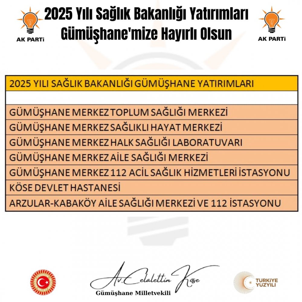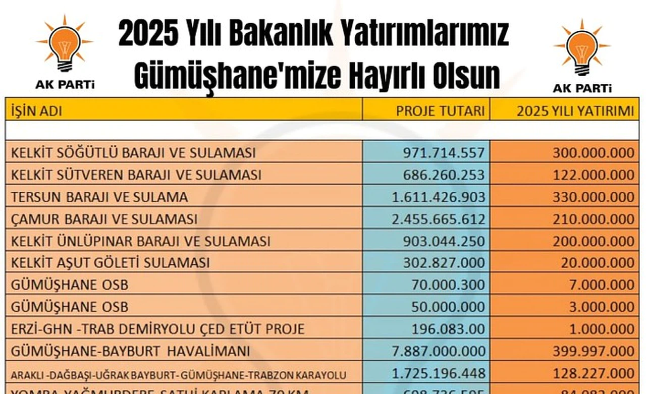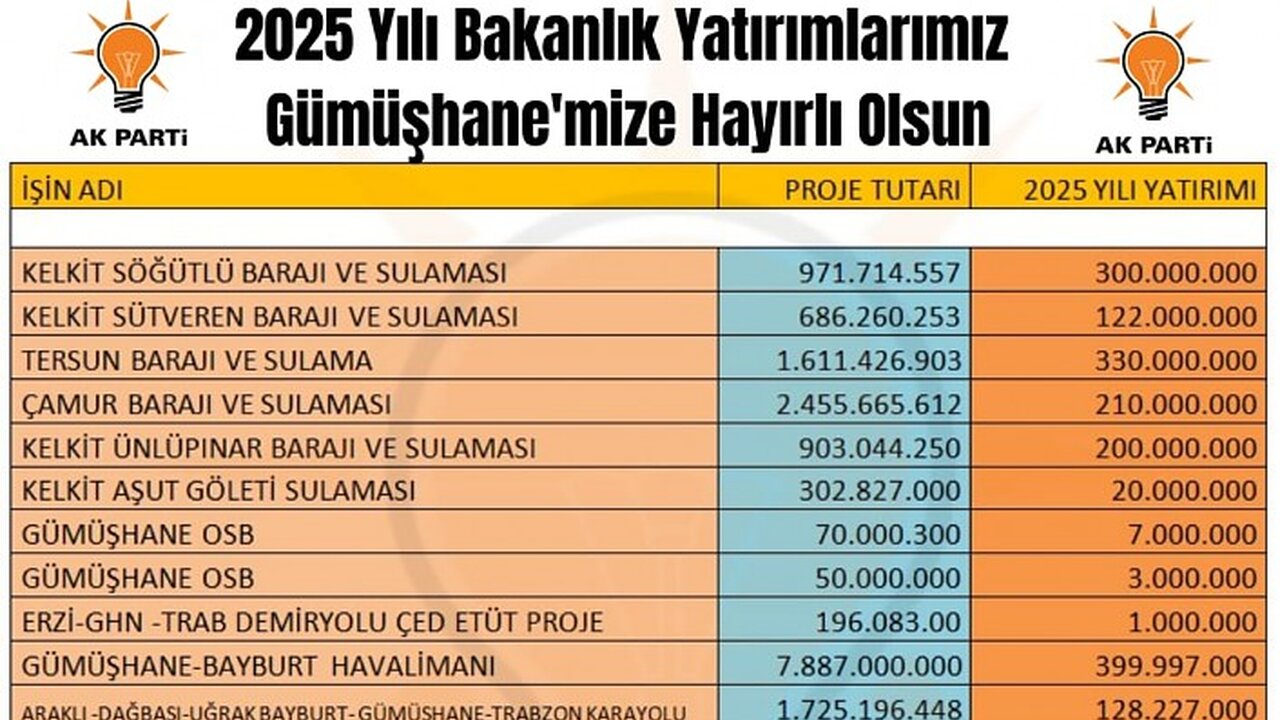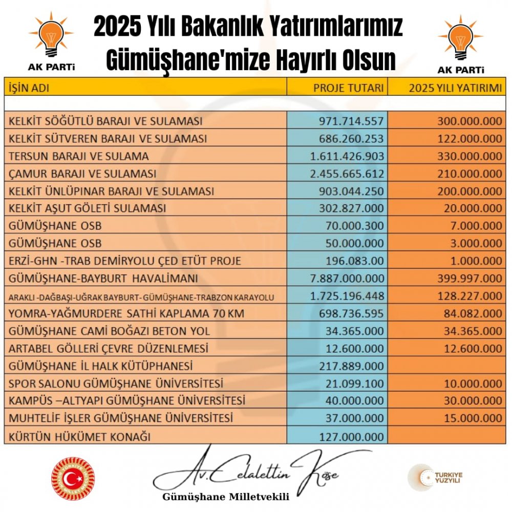 Yatırım programında barajlardan havalimanına, Gümüşhane OSB’den Erzincan-Gümüşhane-Trabzon Demiryolu ÇED etüt projesine, Cami Boğazı Beton Yoldan Artabel Gölleri Çevre Düzenlemesi, İl Halk Kütüphanesinden Kürtün Hükümet Konağına, Gümüşhane Üniversitesinden Sağlık Bakanlığı’nın merkez toplum sağlığı merkezi, sağlıklı hayat merkezi, halk sağlığı laboratuvarı, aile sağlığı merkezi, 112 acil sağlık hizmetleri istasyonu, köse devlet hastanesi, arzular-kabaköy aile sağlığı merkezi ve 112 istasyonuna kadar çok sayıda başlık yer aldı.