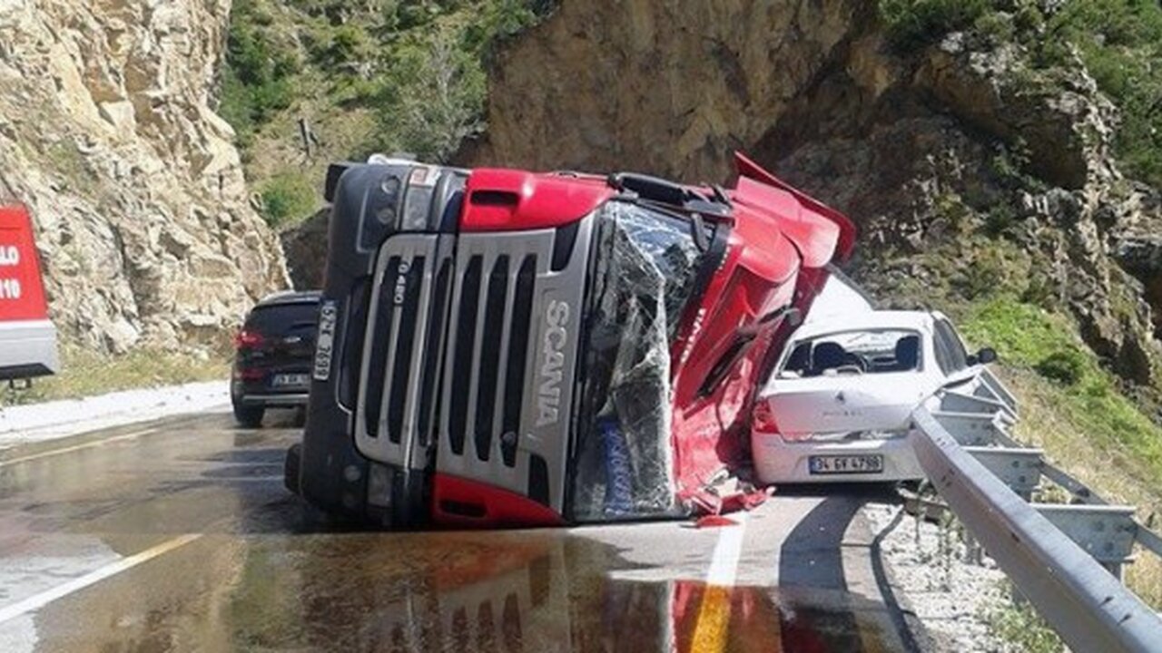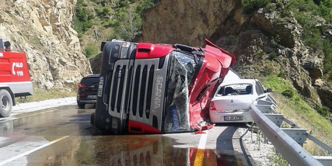Edinilen bilgiye göre Kürtün’den Tirebolu istikametine giden Hüseyin Çiftçi yönetimindeki 52 K 3689 plakalı çimento yüklü tır, Taşlıca köyü tüneli çıkışında viraja hızlı girince kontrolden çıkarak karşı yönden gelen 34 GY 4798 plakalı Mehmet Bektaş yönetimindeki otomobili altına aldı. Kazada çarpışmanın etkisiyle otomobil bariyerlere yapışırken, her iki araçta da ciddi oranda hasar meydana geldi.