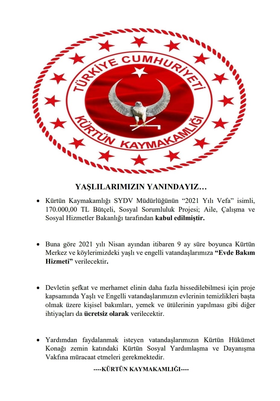 Hazırlanan sosyal sorumluluk projesinin Aile Çalışma ve Sosyal Hizmetler Bakanlığınca kabul edildiği ve proje için 170 bin lira bütçe oluşturulduğu kaydedilen açıklamada, “Buna göre 2021 yılı Nisan ayından itibaren 9 ay süre ile Kürtün merkez ve köylerimizdeki yaşlı ve engelli vatandaşlarımıza evde bakım hizmeti verilecektir. Devletin şefkatli ve merhametli elinin daha fazla hissedilmesi için proje kapsamında yaşlı ve engelli vatandaşlarımızın evlerinin temizlikleri başta olmak üzere kişisel bakımları, yemek ve ütülerinin yapılması gibi diğer ihtiyaçları da ücretsiz olarak karşılanacaktır” denildi.