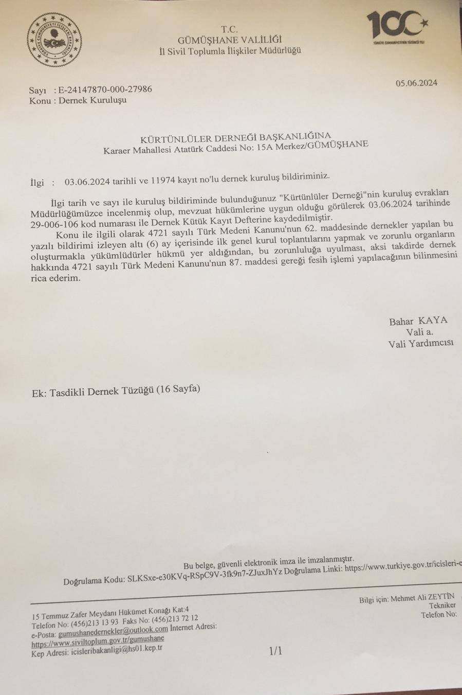 10 kurucu üyenin başvurusu ile Kürtünlüler Derneği Valilik ve İçişleri Bakanlığı onayları ile resmen kurulmuş oldu.