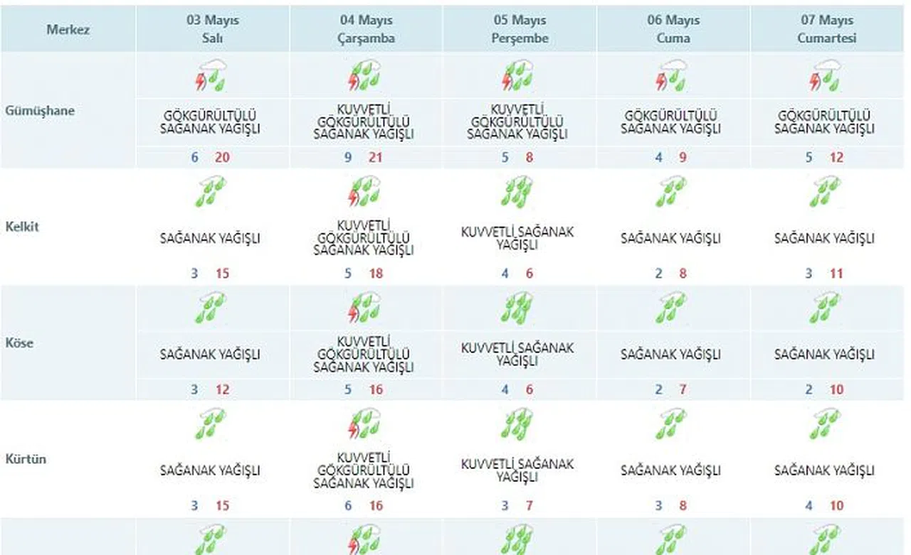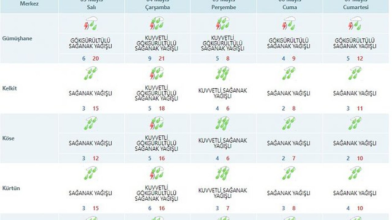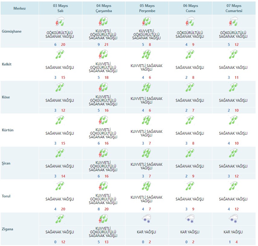 Kuvvetli ve gök gürültülü sağanak yağış uyarısının kent genelinde etkili olduğu Gümüşhane'de hava sıcaklığının birçok ilçede geceleri 2 dereceye kadar düşeceği tahmin ediliyor.