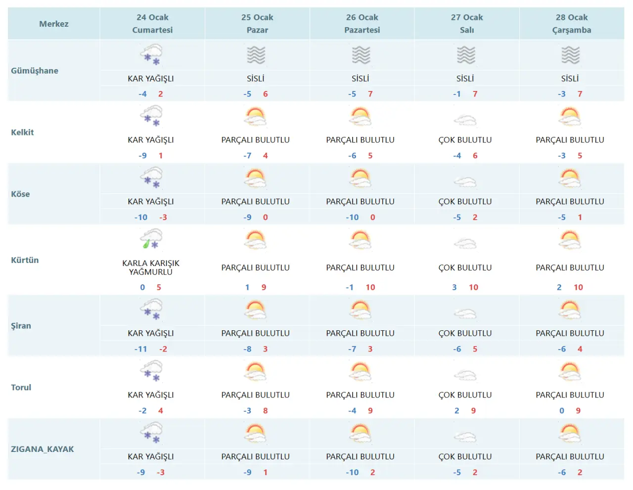 Yapılan son meteorolojik değerlendirmelere göre, Gümüşhane genelinde önümüzdeki bir hafta boyunca yeni bir kar yağışı beklenmiyor, hava sıcaklıklarının hissedilir derecede artacağı tahmin ediliyor.