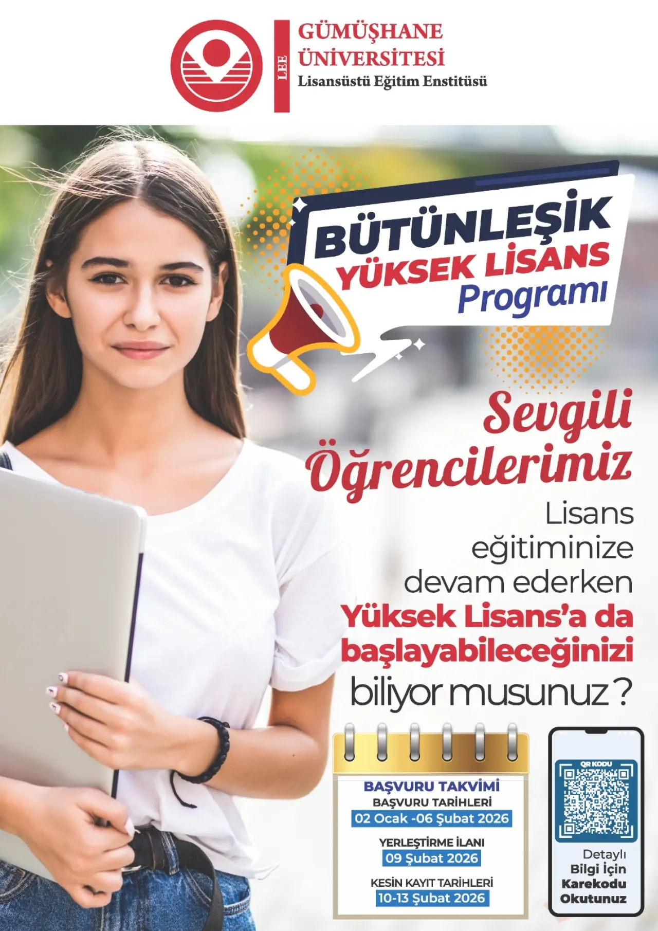 Gümüşhane Üniversitesi, Lisansüstü Eğitim Enstitüsü bünyesinde başlayacak Bütünleşik Yüksek Lisans Programı, başarılı lisans öğrencilerine öğrenimleri sürerken yüksek lisans dersleri alma imkânı sunarak akademik kariyere erken adım atma fırsatı tanıyor.
