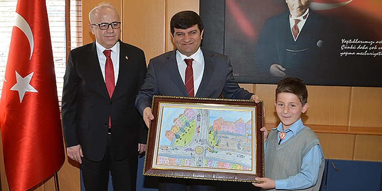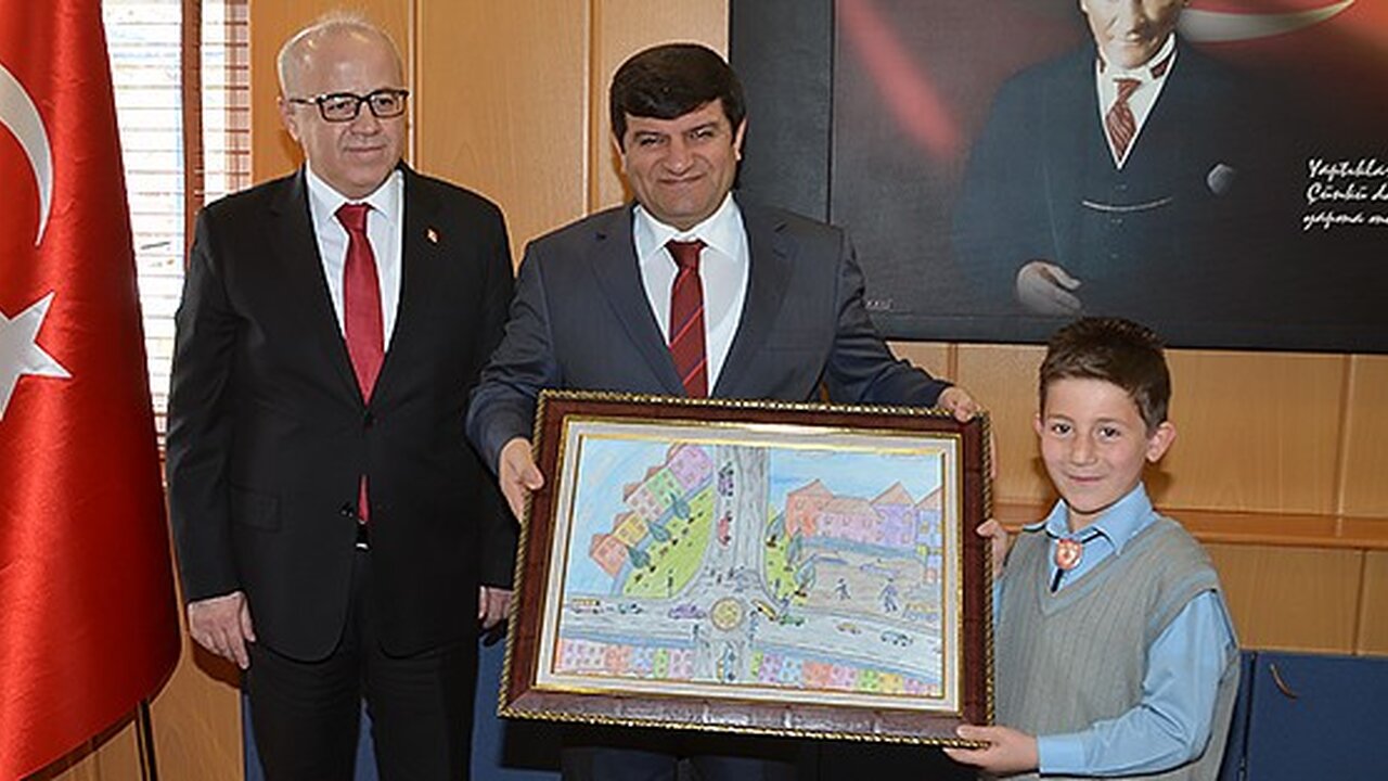 Polis Konulu resim yarışmasında birinci olan Işıl Sema Doğan İlkokulu 3. Sınıf öğrencisi Eray Taştan, kendisine birincilik kazandıran resmini Gümüşhane Valisi Dr. Yusuf Mayda’ya hediye etti.