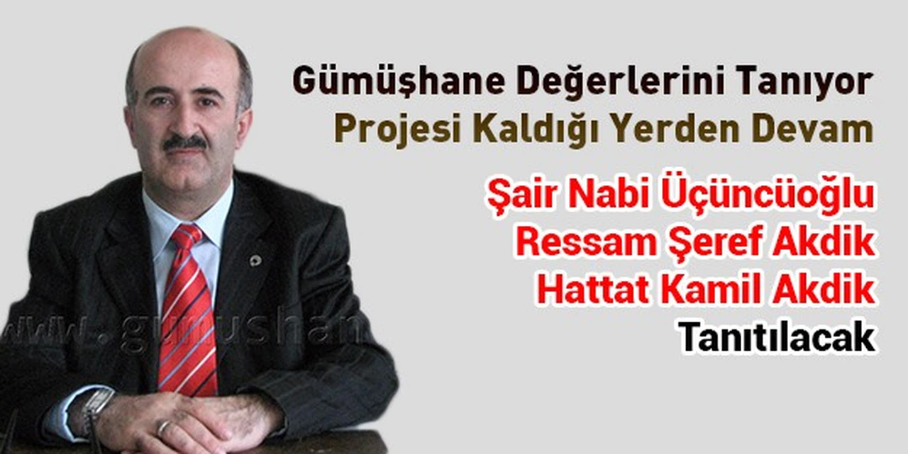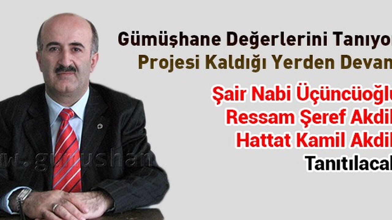 Gümüşhane İl Kültür ve Turizm Müdürü Temel Yalçın, “Gümüşhane Değerlerini Tanıyor Projesi” kapsamında Gümüşhaneli kültür-sanat adamlarından Şair Nabi Üçüncüoğlu, Ressam Şeref Akdik ve Hattat Kamil Akdik için tanıtım programı düzenleneceğini söyledi.
