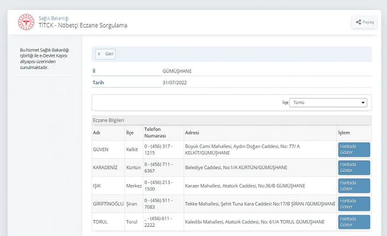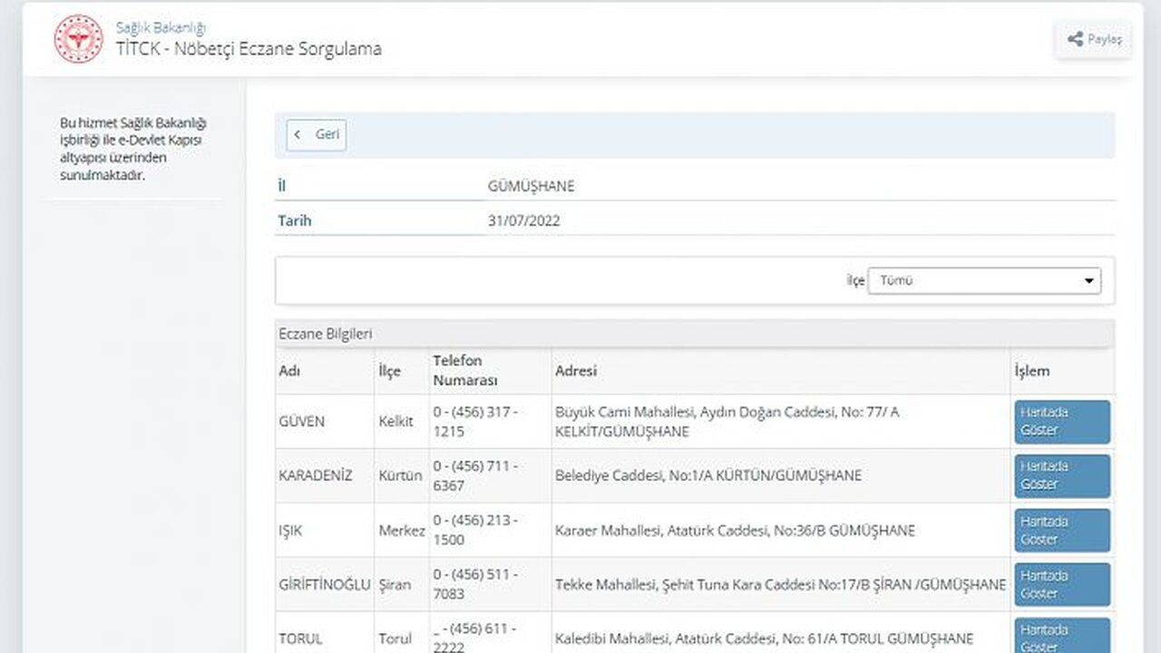 Konuyla ilgili açıklama yapan Başer, “Türkiye İlaç ve Tıbbi Cihaz Kurumu (TİTCK)-Nöbetçi Eczane Sorgulama Hizmeti" e-Devlet kapısında açıldı. Vatandaşlarımız, Türk Eczacıları Birliği (TEB) tarafından bildirilen ve il sağlık müdürlüklerince onaylanan nöbetçi eczane bilgilerine e-Devlet'teki sayfadan ulaşabileceklerdir. Vatandaşlarımız, burada nöbetçi eczanelerin adres bilgilerinin yanı sıra konum bilgilerine de kolaylıkla erişebileceklerdir. Bu hizmete ulaşmak için yapılması gereken tek şey, e-Devlet uygulamasının arama motorundan "TİTCK Nöbetçi Eczane Sorgulama Hizmeti sayfası” na girmektir. Bu şekilde sadece Gümüşhane eczaneleri değil, Türkiye genelindeki tüm nöbetçi eczaneler tek bir sayfada görebilecektir” dedi.