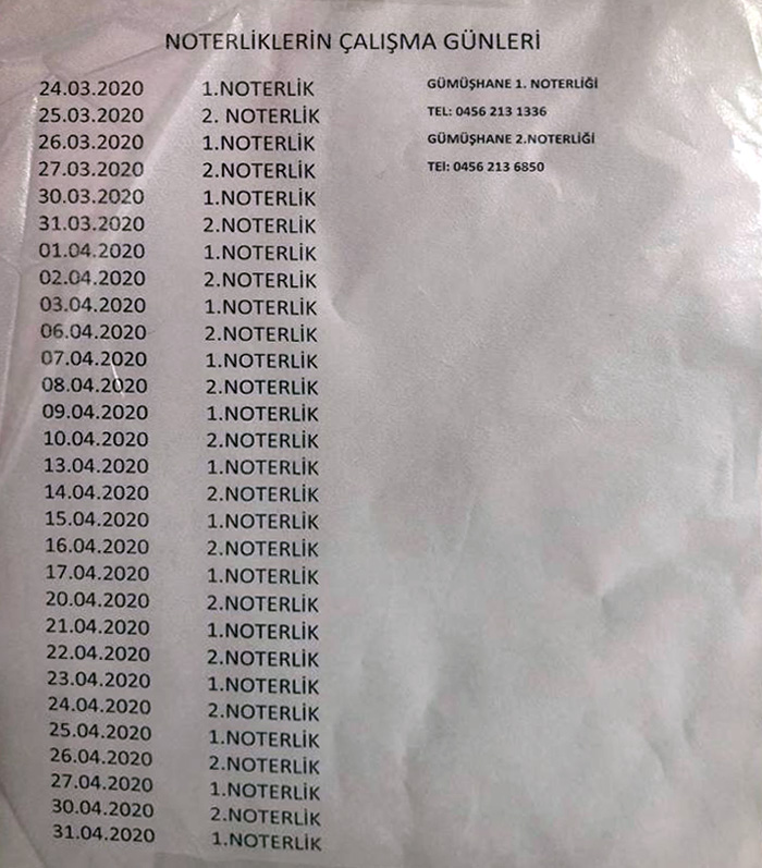 Bugünden geçerli olmak üzere yeni bir karar verilinceye kadar iki noterlik olan yerlerde hafta içi tek rakamlı noterden başlayan uygulama kapsamında Gümüşhane'de bugün sadece 1.noter hizmet verecek. Yarın da sadece 2.noterin hizmet vereceği Gümüşhane'de bu uygulama ikinci bir emre kadar devam edecek.