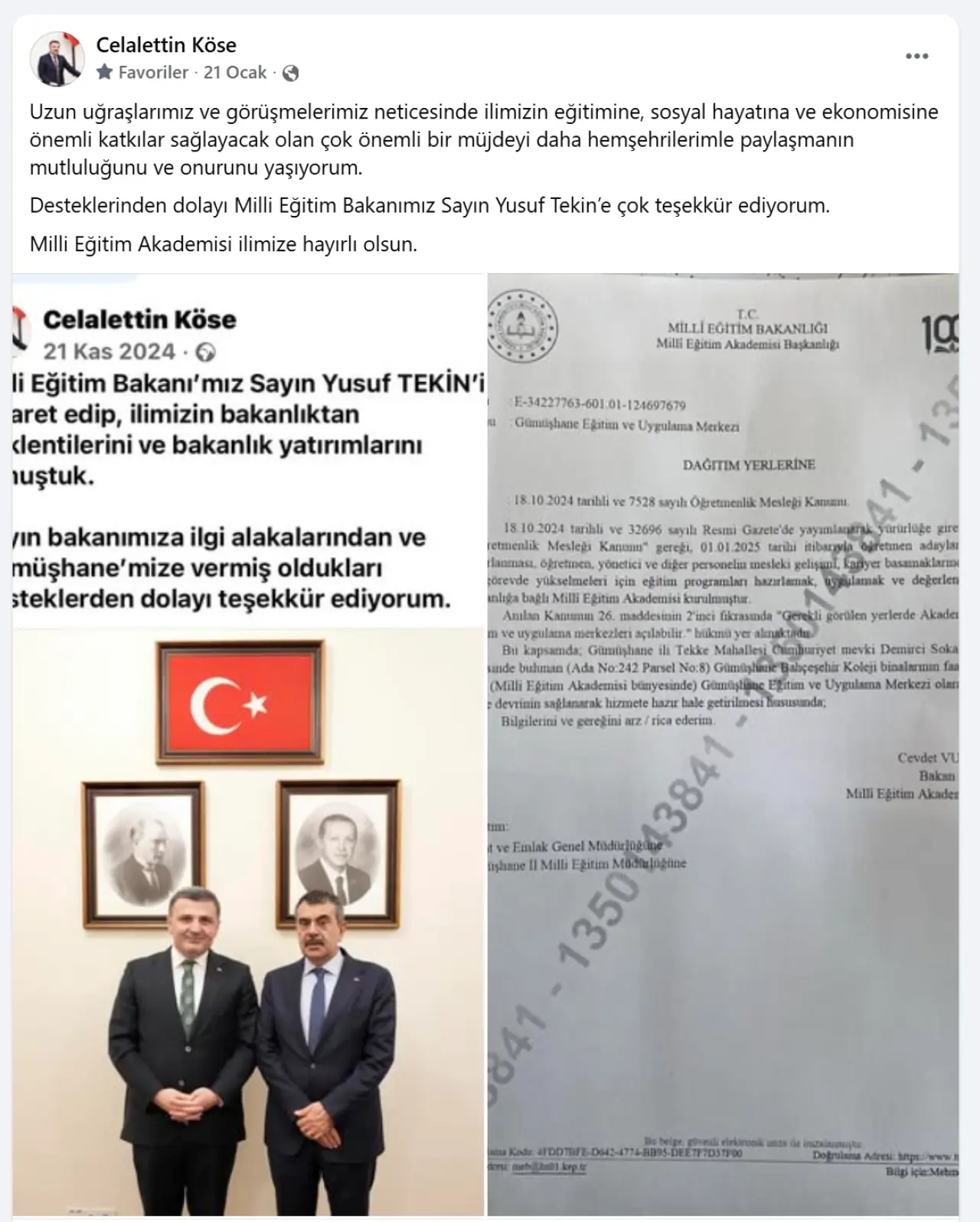 Gümüşhane Kent Konseyi Başkanı Rüstem Demirağ, Milli Eğitim Bakanlığı tarafından kurulması planlanan Milli Eğitim Akademisi’nin Tekke’de bulunan atıl okul binasıyla birlikte Gümüşhane'ye kazandırılması gerektiğini söylemiş ardından AK Parti Gümüşhane Milletvekili Av. Celalettin Köse, 21 Ocak 2025 tarihinde sosyal medya hesabından yaptığı paylaşımda “Uzun uğraşlarımız ve görüşmelerimiz neticesinde ilimizin eğitimine, sosyal hayatına ve ekonomisine önemli katkılar sağlayacak olan çok önemli bir müjdeyi daha hemşehrilerimle paylaşmanın mutluluğunu ve onurunu yaşıyorum. Desteklerinden dolayı Milli Eğitim Bakanımız Sayın Yusuf Tekin’e çok teşekkür ediyorum. Milli Eğitim Akademisi ilimize hayırlı olsun” demişti.