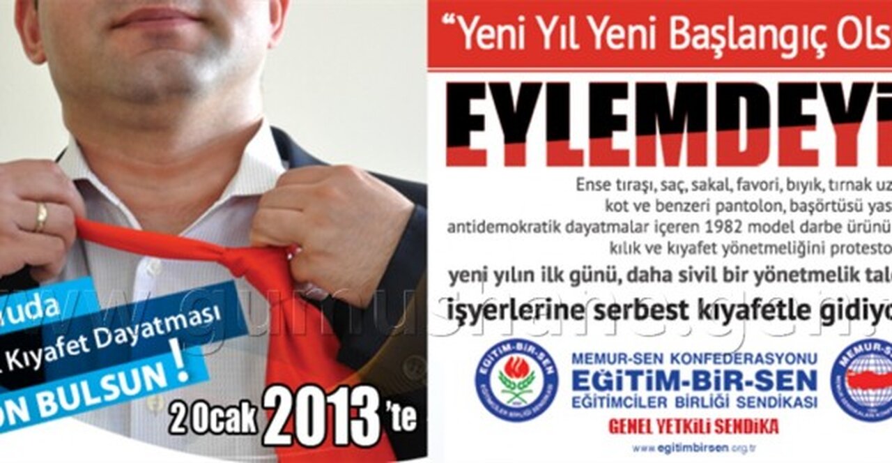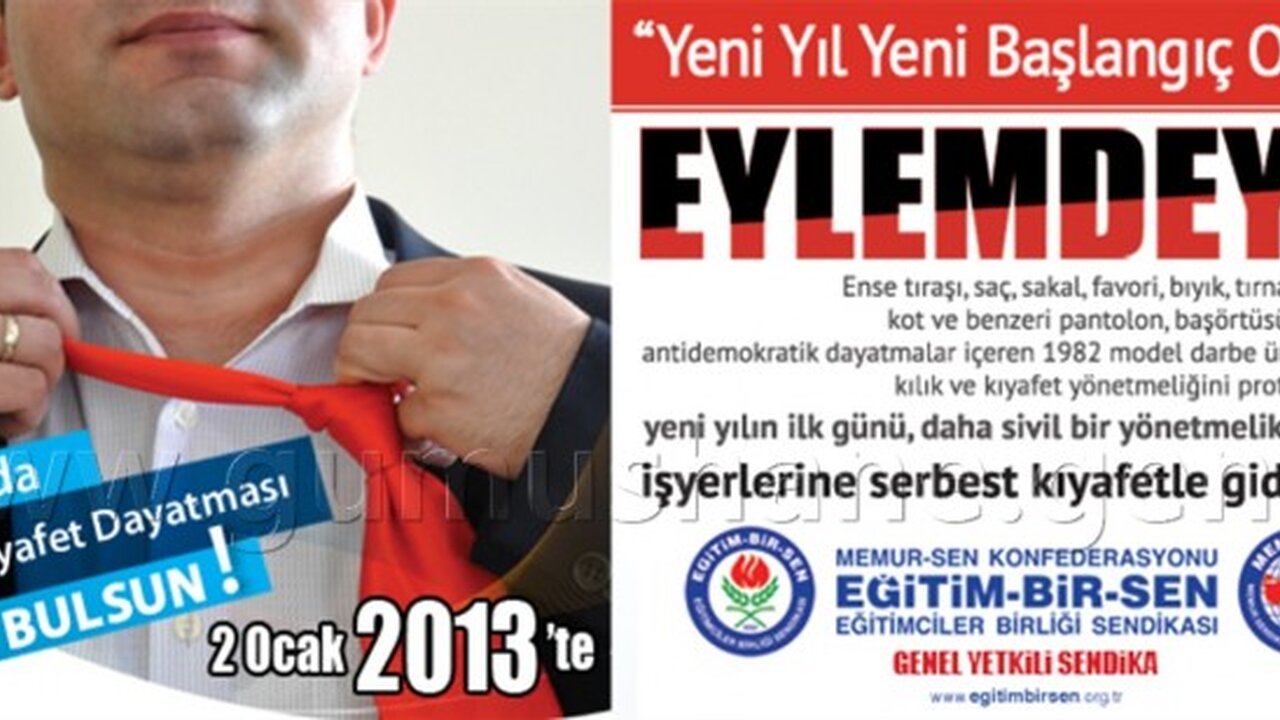 Yaptığı açıklamada Eğitim Bir Sen’nin 2 Ocak 2013 Çarşamba günü “İş Yerlerine Sivil Gitme” eylemi yapacağını ifade eden Ağaç, “Geçtiğimiz günlerde yürürlüğe konulan ve 2013-2014 eğitim-öğretim yılında uygulamaya geçilecek olan öğrencilere kılık-kıyafet serbestisinin ardından öğretmenler için de kılık-kıyafet serbestisi getirilmesi için daha önce 10 Aralık İnsan Hakları Günü’nde ilimizde yaptığımız eyleme bir yenisini daha ekliyoruz.” dedi.