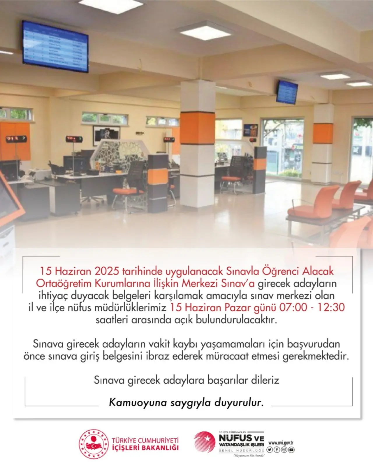 “15 Haziran 2025 tarihinde uygulanacak Sınavla Öğrenci Alacak Ortaöğretim Kurumlarına İlişkin Merkezi Sınav'a girecek adayların ihtiyaç duyacak belgeleri karşılamak amacıyla sınav merkezi olan il ve ilçe nüfus müdürlüklerimiz 15 Haziran Pazar günü 07.00-12.30 saatleri arasında açık bulundurulacaktır. Sınava girecek adayların vakit kaybı yaşamamaları için başvurudan önce sınava giriş belgesini ibraz ederek müracaat etmesi gerekmektedir. Sınava girecek tüm adaylara başarılar dileriz” ifadeleri kullanıldı.
