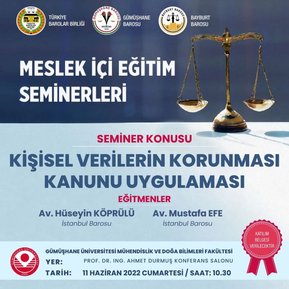 Akşam yemeğinde Ramada Gümüşhane otelde meslek mensuplarıyla buluşacak olan Sağkan ve yönetim kurulu üyeleri 11 Haziran Cumartesi günü ise Gümüşhane Üniversitesi Mühendislik ve Doğa Bilimleri Fakültesi, Prof.Dr. Ing. Ahmet Durmuş Konferas Salonunda Türkiye Barolar Birliği, Gümüşhane Barosu ve Bayburt Barosu tarafından düzenlenen ve İstanbul Barosundan Av.Hüseyin Köprülü ve Av.Mustafa Efe'nin eğitimci olarak katılacağı “Kişisel verilen korunması Kanunu Uygulaması” konulu meslek içi eğitim seminerinde bulunacak.