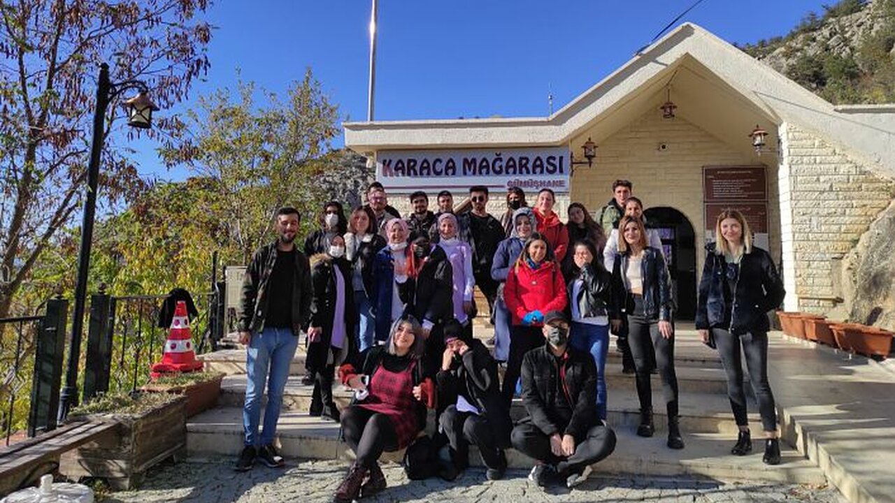 Rektörlük binası önünden hareketle başlayan uygulama programı otobüs içinde Doç. Dr. Akdu’nun güzergâh ve genel bilgi aktarımıyla devam etti. Öncelikle Karaca Mağarasının efsanesini anlatan Doç. Dr. Akdu akabinde mağaranın turizme kazandırılmasında rol oynayan ilk bilimsel yayın olan Dr. Ali Uzun tarafından hazırlanan çalışmaya dikkat çekti.