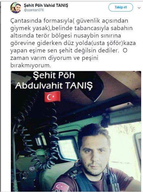 Hemşehrimiz Abdulvahit Tanış'ın eşi “Çantasında formasıyla (güvenlik açısından giymek yasak), belinde tabancasıyla sabahın altısında terör bölgesi Nusaybin sınırına görevine giderken düz yolda (usta şöför) kaza yapan eşime sen şehit değilsin dediler. O zaman varım diyorum ve peşini bırakmıyorum” diyerek sosyal medya hesabından tepkisini dile getirdi.