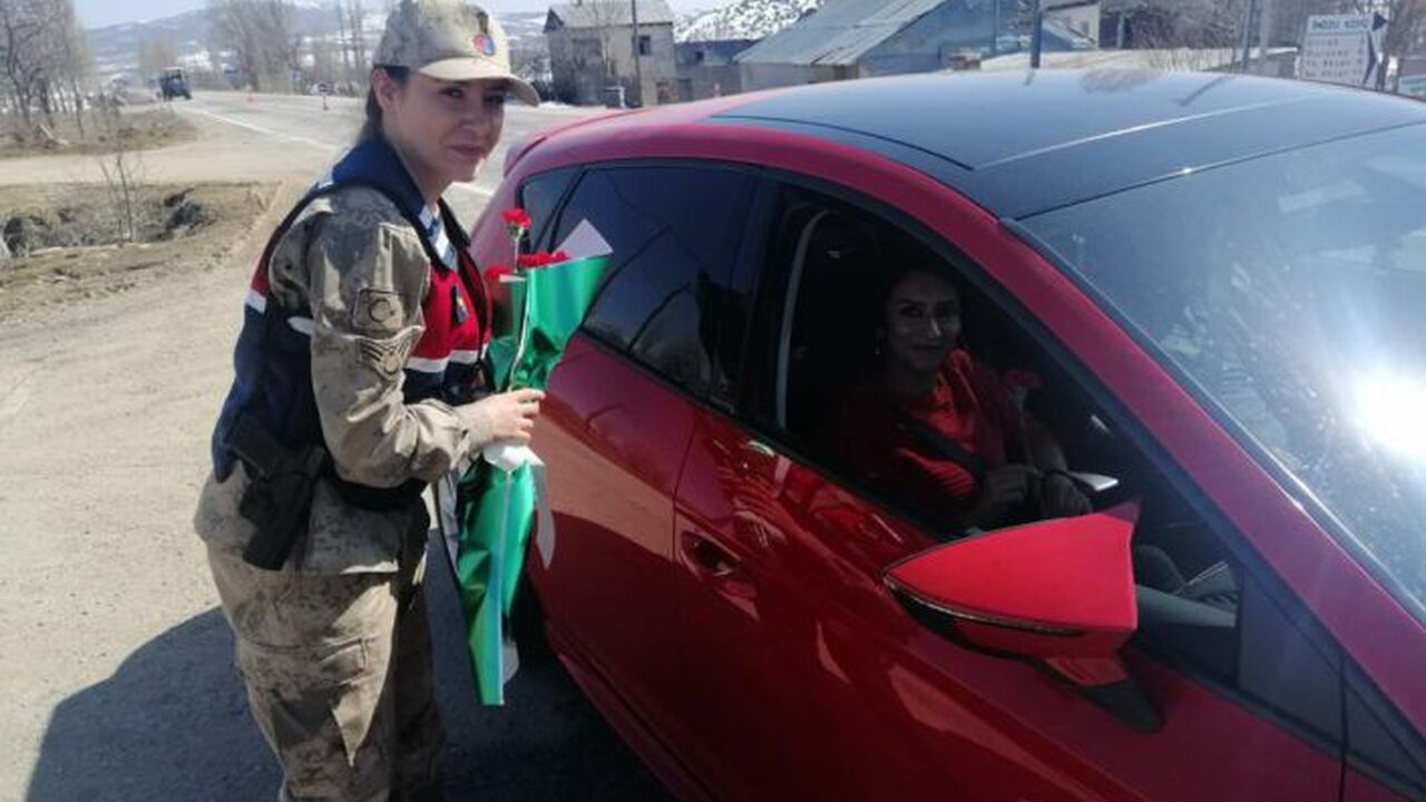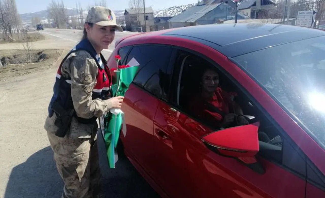 Gümüşhane’nin Şiran ilçesi Jandarma komutanlığı ekipleri trafik ve asayiş kontrolünde kadınlara karanfil dağıttı.
