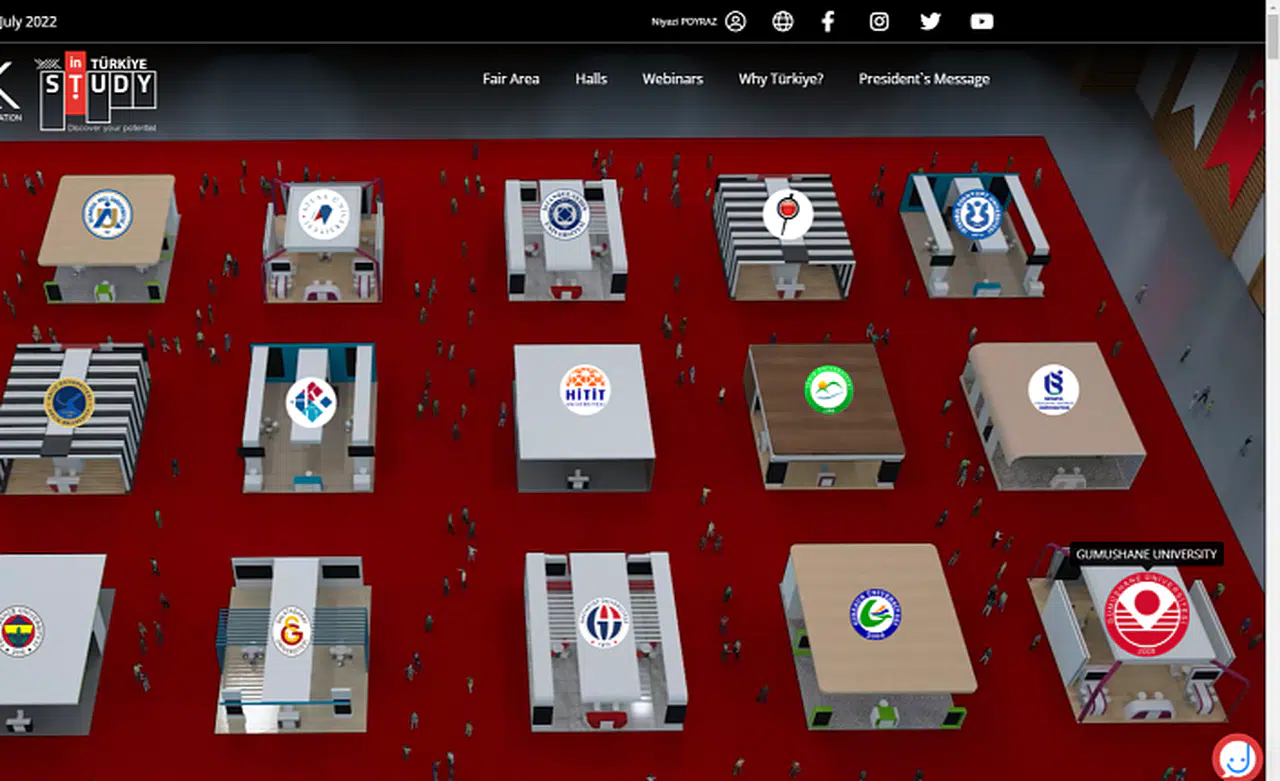 20-22 Temmuz 2022 tarihleri arasında sanal ortamda ziyaretçilerine kapısını açan sanal fuar, dikkatlerin Türk yükseköğretimine çekilmesine vesile oldu. Türk yükseköğretim sistemini potansiyel uluslararası öğrencilere dijital ortamda tanıtmak amacıyla gerçekleştirilen fuara katılan Üniversitemiz 5’inci salonda kendisine ayrılan stantta Türkçe, İngilizce ve Arapça olarak hazırladığı tanıtım materyalleriyle aday öğrencilerle buluştu.