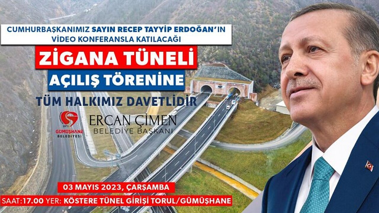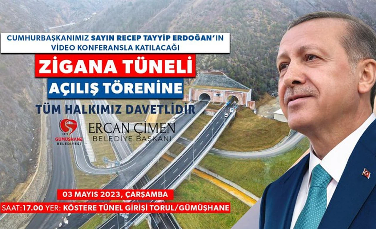 Belediye Başkanı Ercan Çimen, Doğu Karadeniz ve Kafkasları, Ortadoğu ve İran’a bağlayan Gümüşhane-Trabzon karayolu ve Tarihi İpek Yolu güzergahındaki dev proje olan Yeni Zigana Tünelinin 3 Mayıs Çarşamba günü Cumhurbaşkanı Recep Tayyip Erdoğan tarafından telekonferans yöntemiyle açılacağını söyledi.