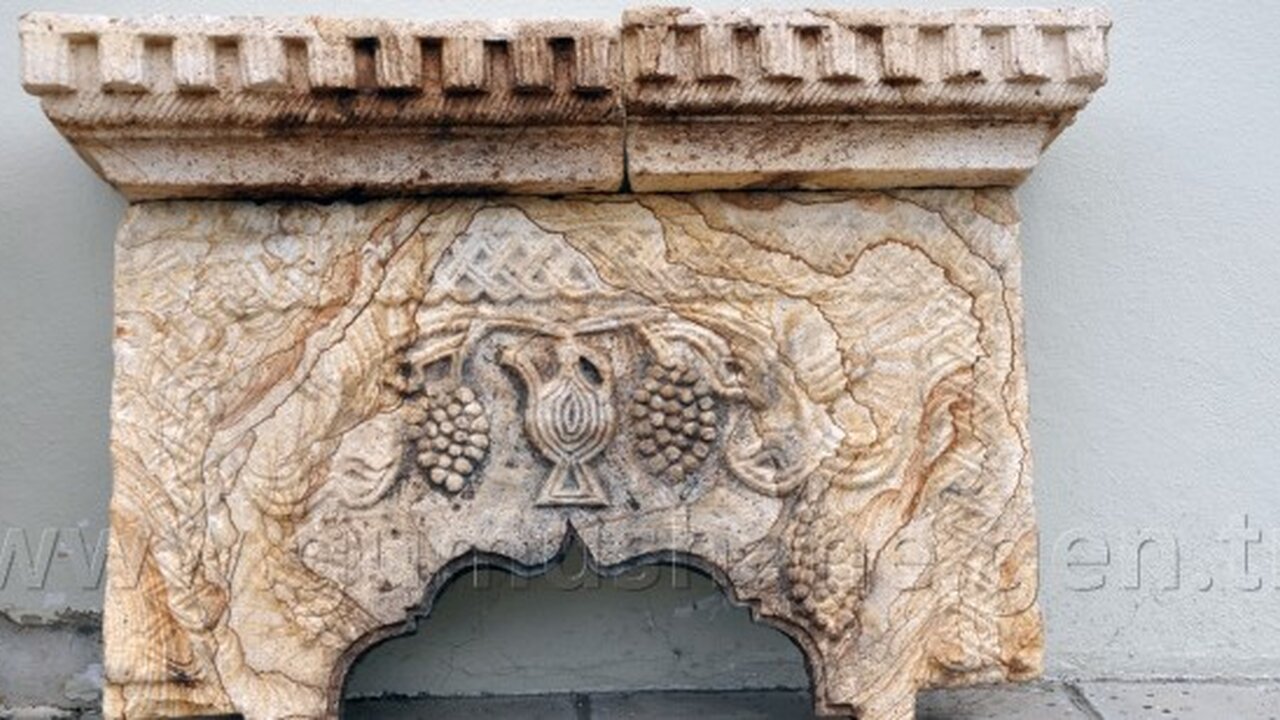 Şömine taşının alınlık hariç yüksekliğinin 54 santimetre, genişliğinin ise 85 santimetre olduğunu ifade eden Yalçın, taşın özelliklerini şöyle sıraladı: “Taş oyma sanatının 19. yüzyıl örneklerinden biri olan Şömine Taşının üzerinde 4 adet üzüm salkımı ve bir adet ibrik bezemesi yer almaktadır. İbrik motifi ve üzüm salkımlarının çevresinde iç içe geçmiş geometrik motiflerden oluşan bir bordür işlenmiştir. Motifler, taş üzerine sonradan eklenmemiş, taşın kendisi işlenerek oluşturulmuştur. Alt kısmı kemer şeklinde oyulmuş olan şöminenin alınlık kısmında, üst kısmı yarım daire biçiminde 4,5 cm uzunluğunda kabartmalar yer almaktadır. Şömine Taşı üzerinde yer alan üzüm salkımı kabartmaları, zenginliği ve bereketi ifade ederken, ibrik motifi ise eşya sahibinin abdestli ve namazlı biri olduğunu gösterir.”