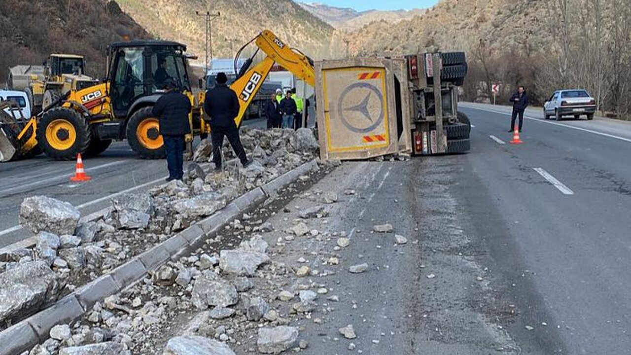 Kaza sonucunda kamyonun kasasındaki taşlar bölünmüş yolun ortasındaki refüje ve yola dökülünce ulaşım bir süre durdu.