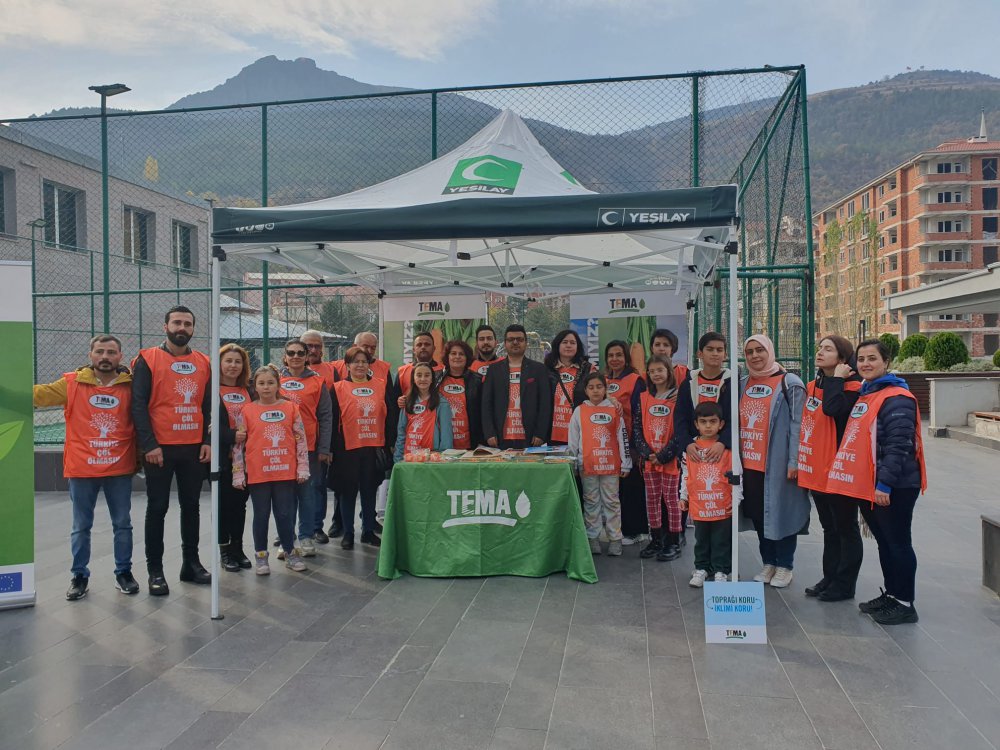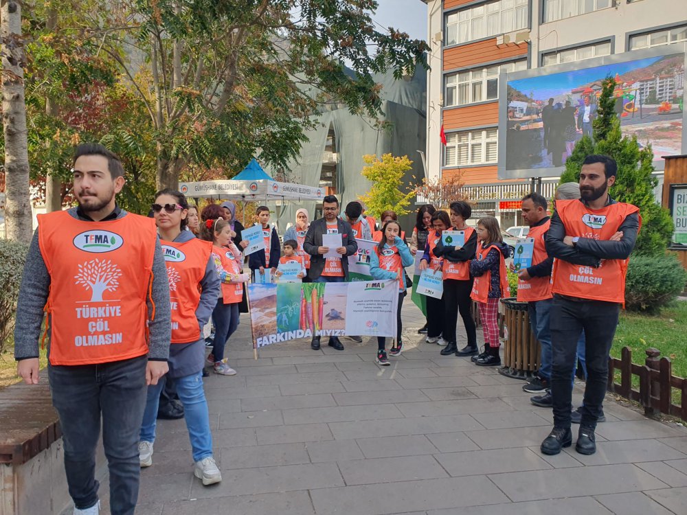 Gümüşhane Belediyesi önünde toplanan yetişkin ve minik TEMA gönüllüleri “Türkiye Çöl Olmasın” sloganıyla erozyon sorununa dikkat çekti.