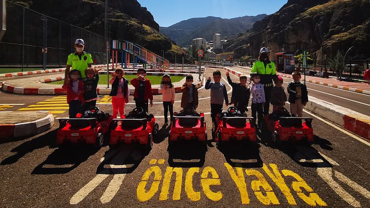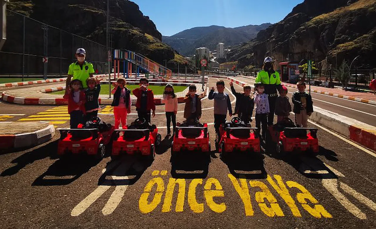 İçişleri Bakanı Süleyman Soylu’nun insanı önceleyen, insan odaklı trafik vizyonu çerçevesinde Gümüşhane Valiliğince yaptırılan Trafik Eğitim Parkında, anaokulları öğrencilerine verilen eğitimlerde çocukların trafikte ne yapmaları gerektiği, üst geçitlerin nasıl kullanılacağı, trafik levha ve ışıklarının ne işe yaradıkları, yaya, sürücü ve yolcu olarak nelere dikkat edilmesi gerektiği anlatılırken, emniyet kemerinin önemi anlatılıyor.