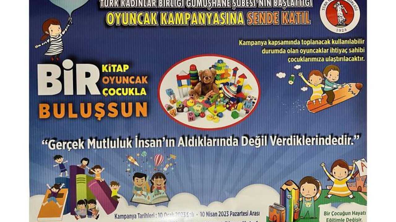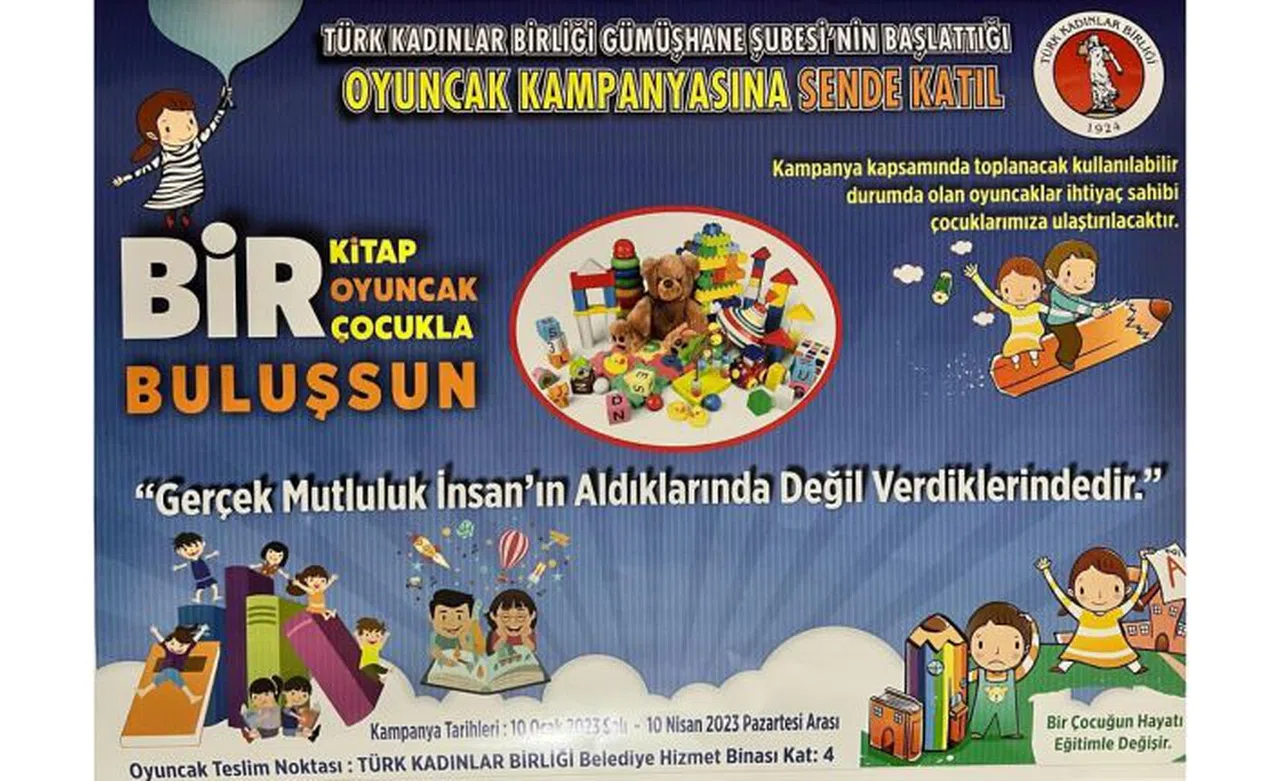 Türk Kadınlar Birliği Gümüşhane Şubesi “Bir kitap, bir oyuncak bir çocukla buluşsun” sloganıyla oyuncak ve kitap kampanyası başlattı.