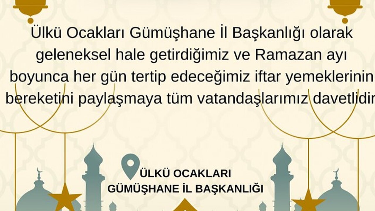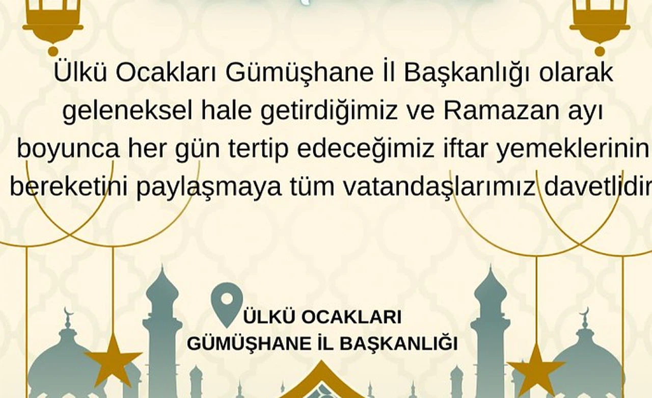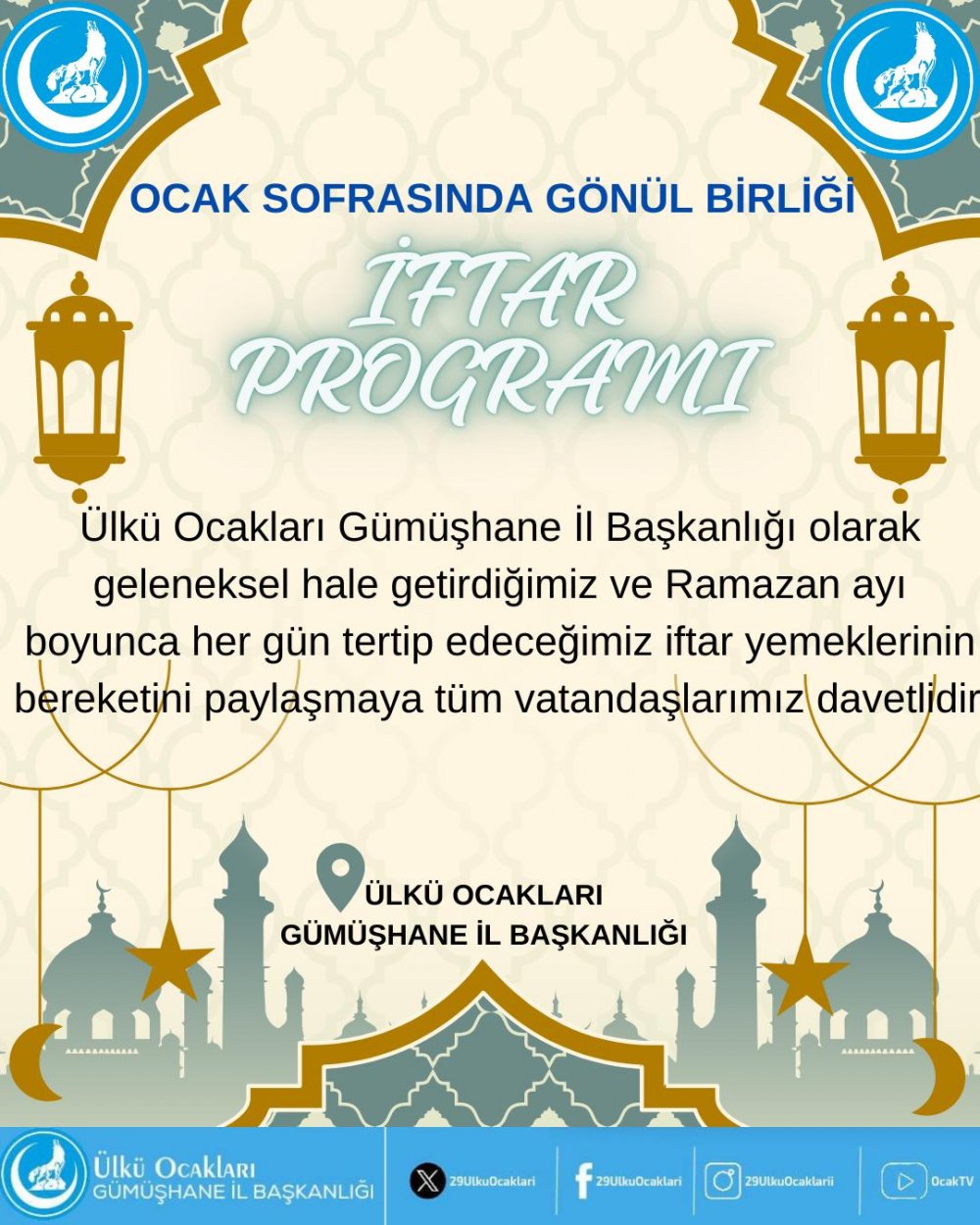 Konuyla ilgili açıklama yapan Ülkü Ocakları Gümüşhane İl Başkanı Sadık Coşkun, dava arkadaşlarının destekleriyle Ocak binasına kurulacak iftar sofrasına herkesi davet ederek, Ramazan ayı boyunca milletin yanında olmaya devam edeceklerini söyledi.