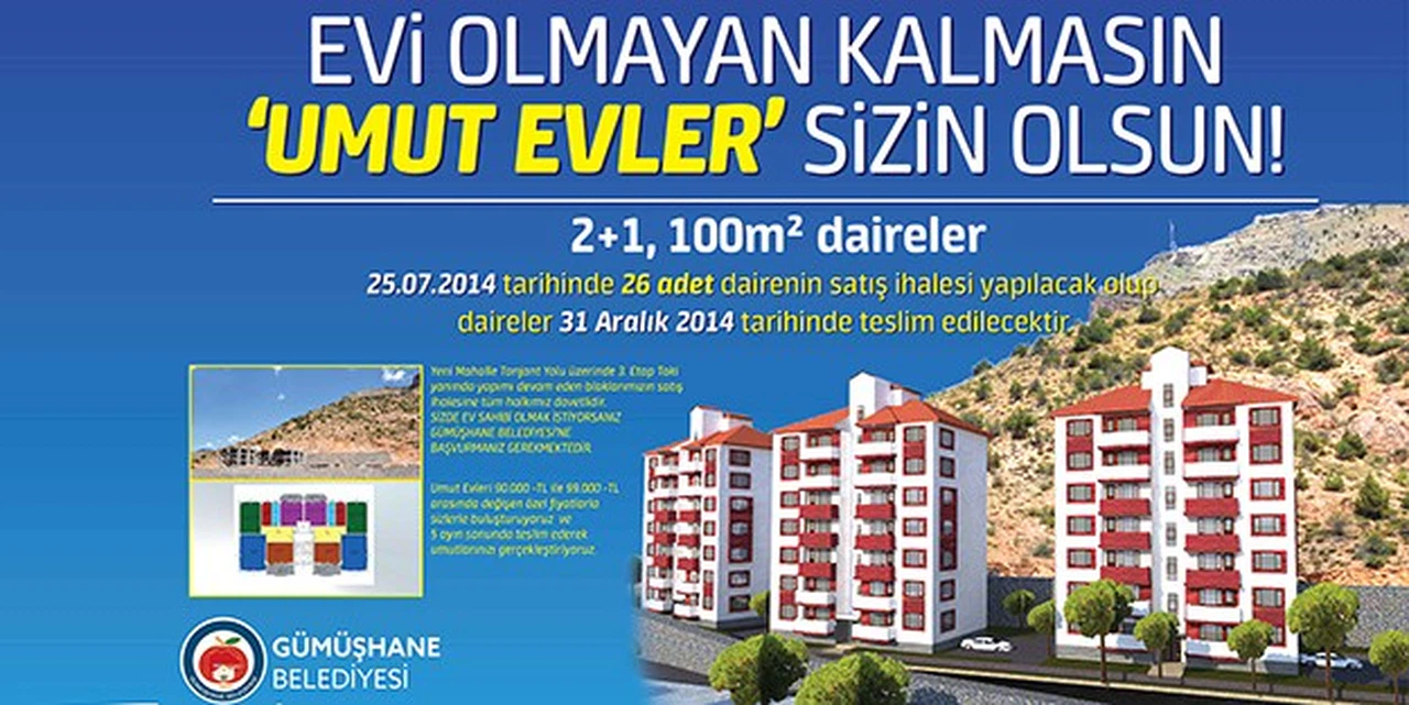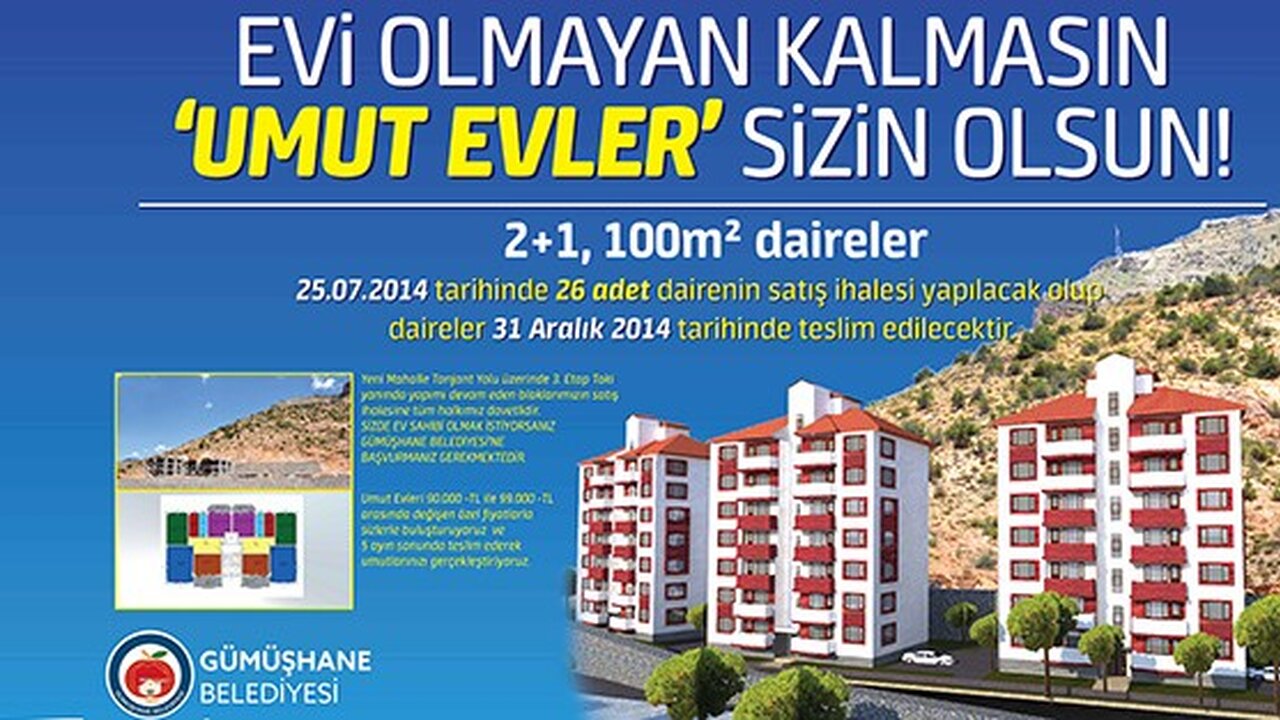 Belediye’den yapılan açıklamada 3 bloktan oluşan Umut Evler projesinde 90-99 bin lira fiyat aralığındaki 2+1 100 metrekare dairelerin 31 Aralık 2014 tarihinde teslim edileceği belirtilerek tüm vatandaşlar ihaleye davet edildi.