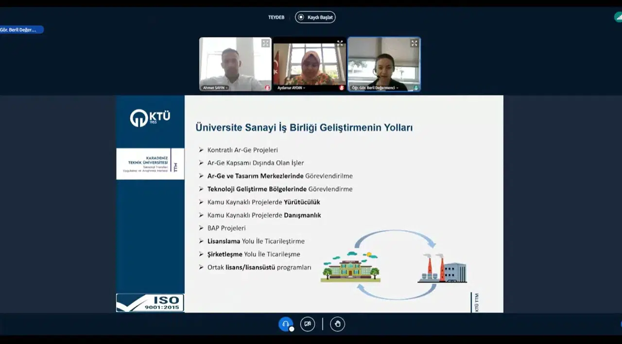 TTO tarafından üniversite ile sanayi arasındaki etkileşimi güçlendirmek ve bilgi ile teknolojinin ekonomik değere dönüştürülmesini teşvik etmek amacıyla “Üniversite-Sanayi İş Birliği Süreçleri” konulu bir etkinlik düzenlendi. Moderatörlüğünü TTO uzmanlarından Öğr. Gör. Ahmet Sayın’ın üstlendiği programda, Karadeniz Teknik Üniversitesi’nden Öğr. Gör. Beril Değermenci konuşmacı olarak yer aldı.
