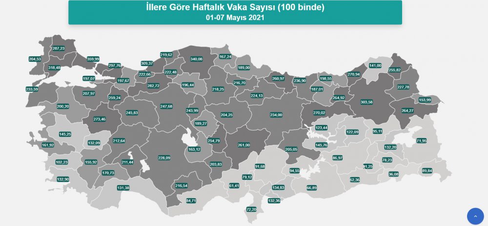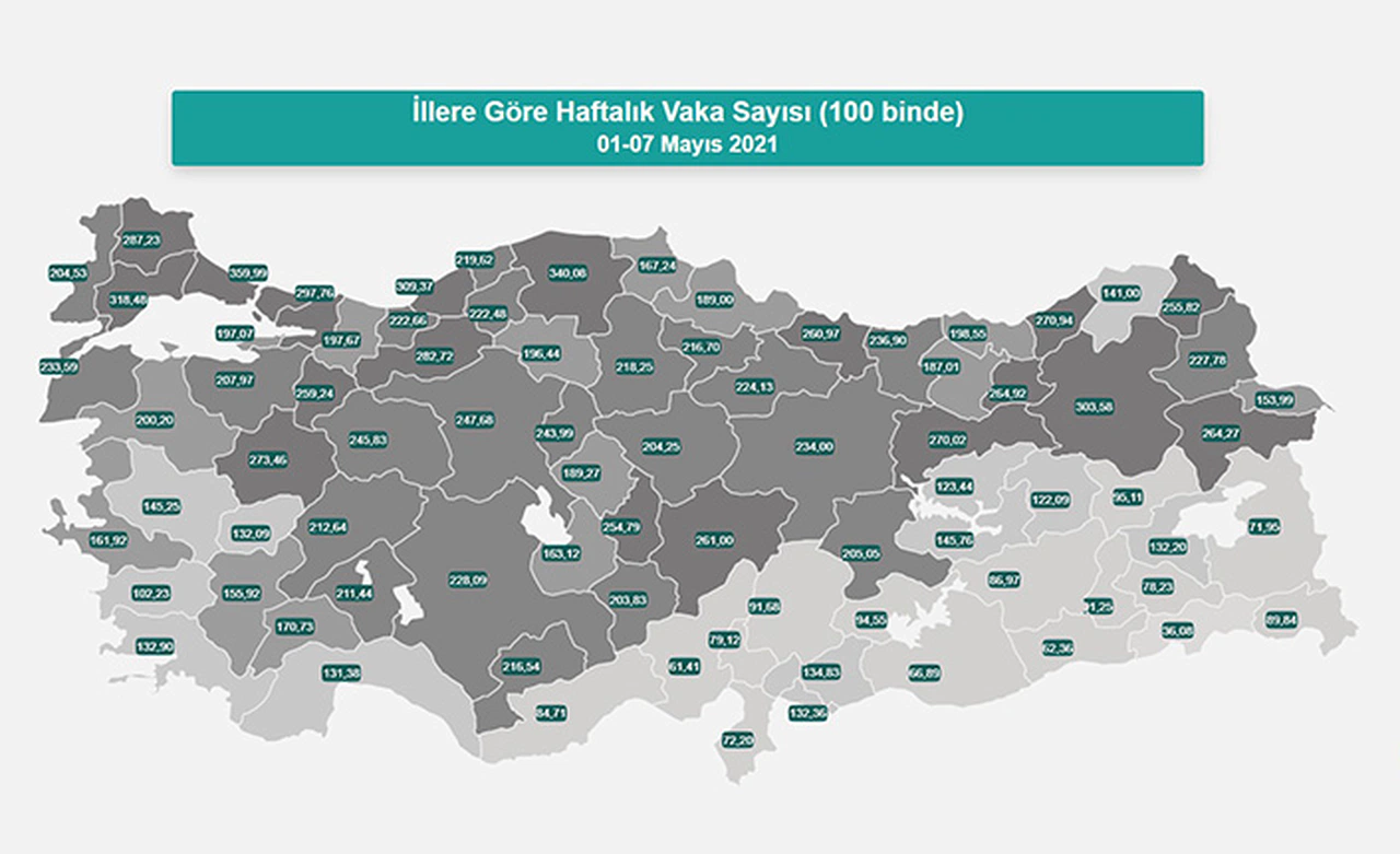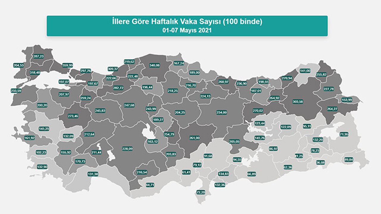 İşte İllere Göre Haftalık Vaka Sayısı (100 binde) (1-7 Mayıs 2021) en çoktan aza doğru sıralaması: