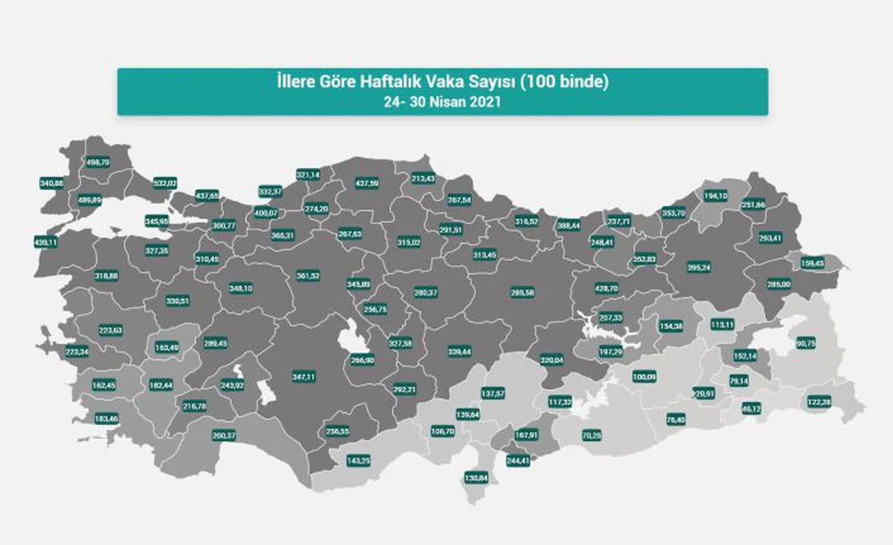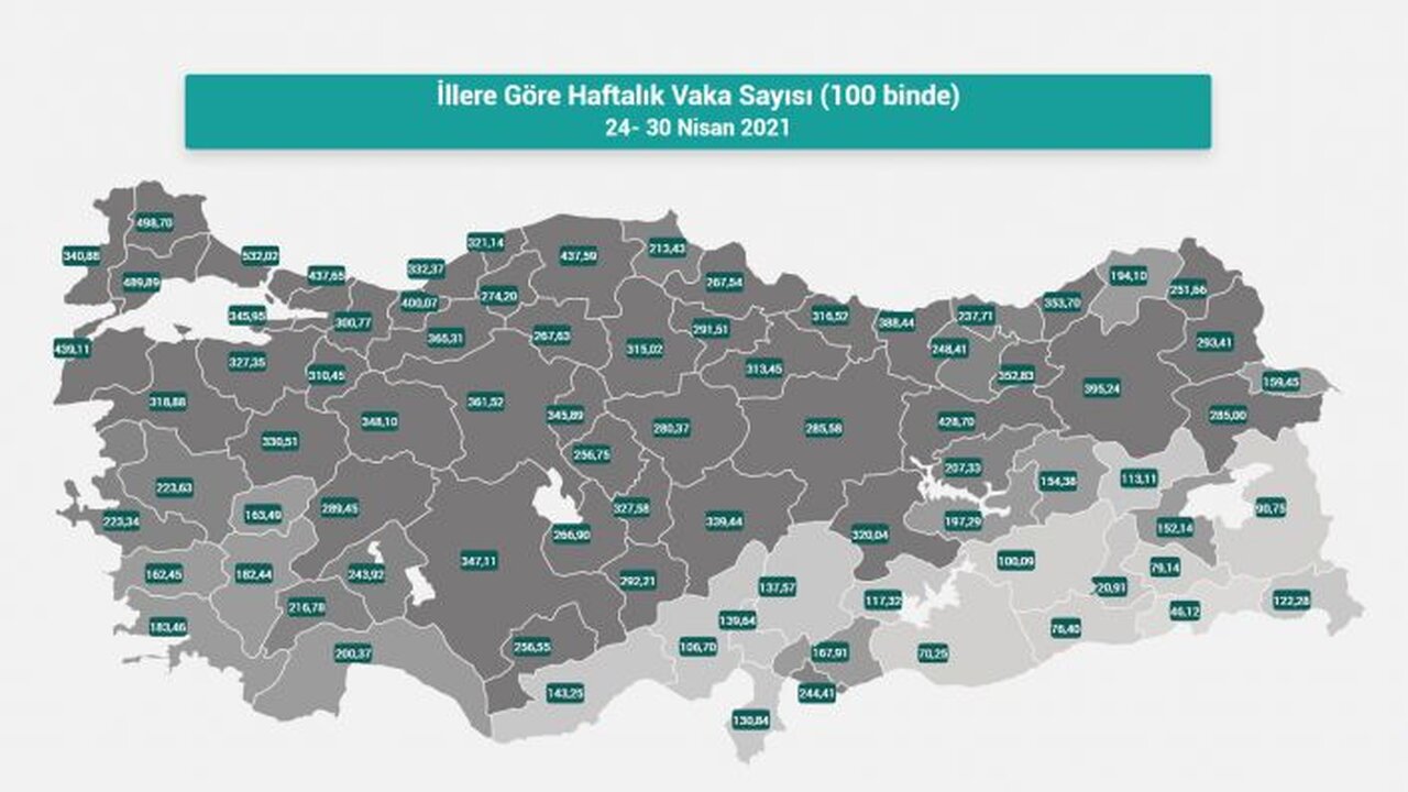İşte İllere Göre Haftalık Vaka Sayısı (100 binde) (24-30 Nisan 2021) en çoktan aza doğru sıralaması: