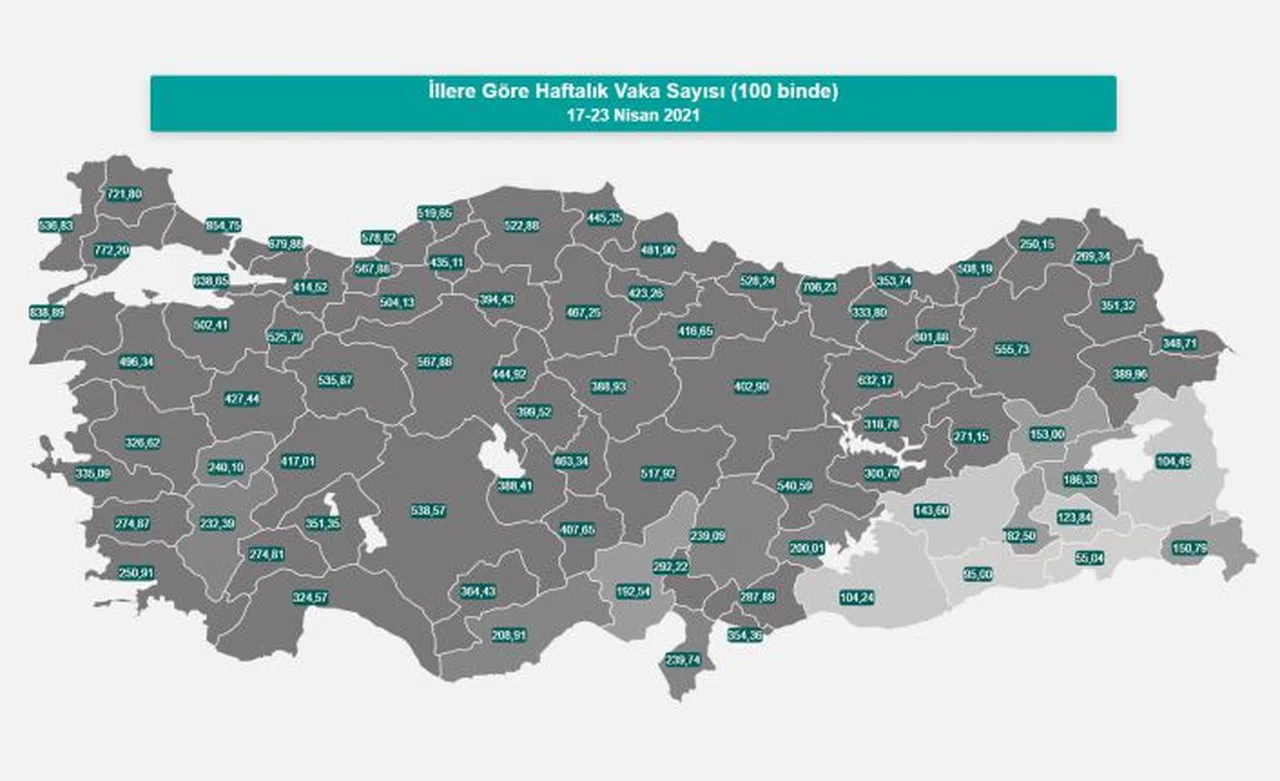 İşte İllere Göre Haftalık Vaka Sayısı (100 binde) (17-23 Nisan 2021) en çoktan aza doğru sıralaması: