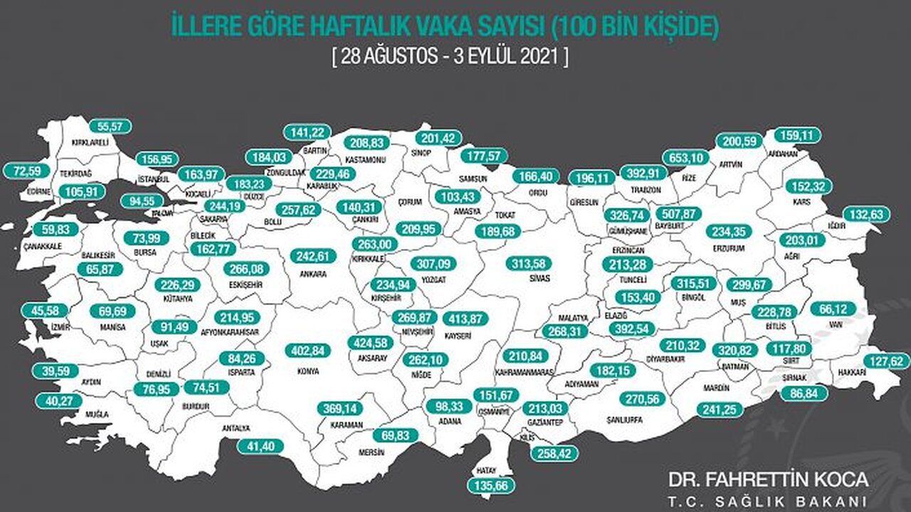 Sağlık Bakanı Dr. Fahrettin Koca, 28 Ağustos-3 Eylül tarihleri arasında illere göre her 100 bin kişide görülen Covid-19 vaka sayılarını açıkladı. Rakamlara göre Gümüşhane’de vaka sayısı bir önceki haftaya göre yüzde 6 oranında artarken, Türkiye sıralamasında 9.sırada yer aldı.