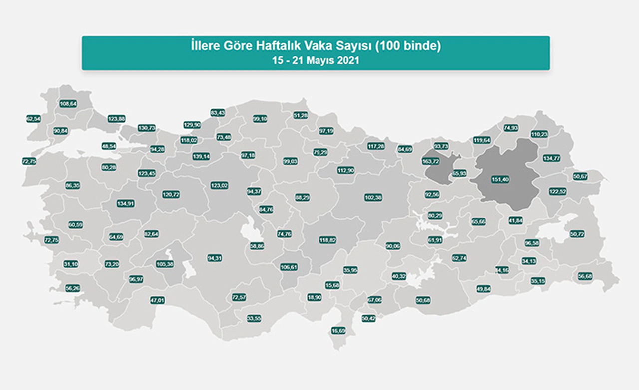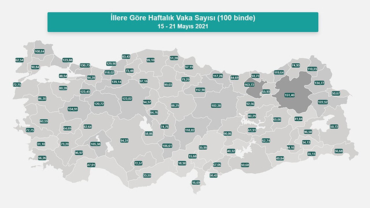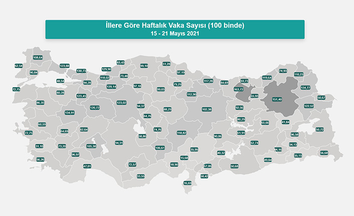 İşte İllere Göre Haftalık Vaka Sayısı (100 binde) (15-21 Mayıs 2021) en çoktan aza doğru sıralaması: