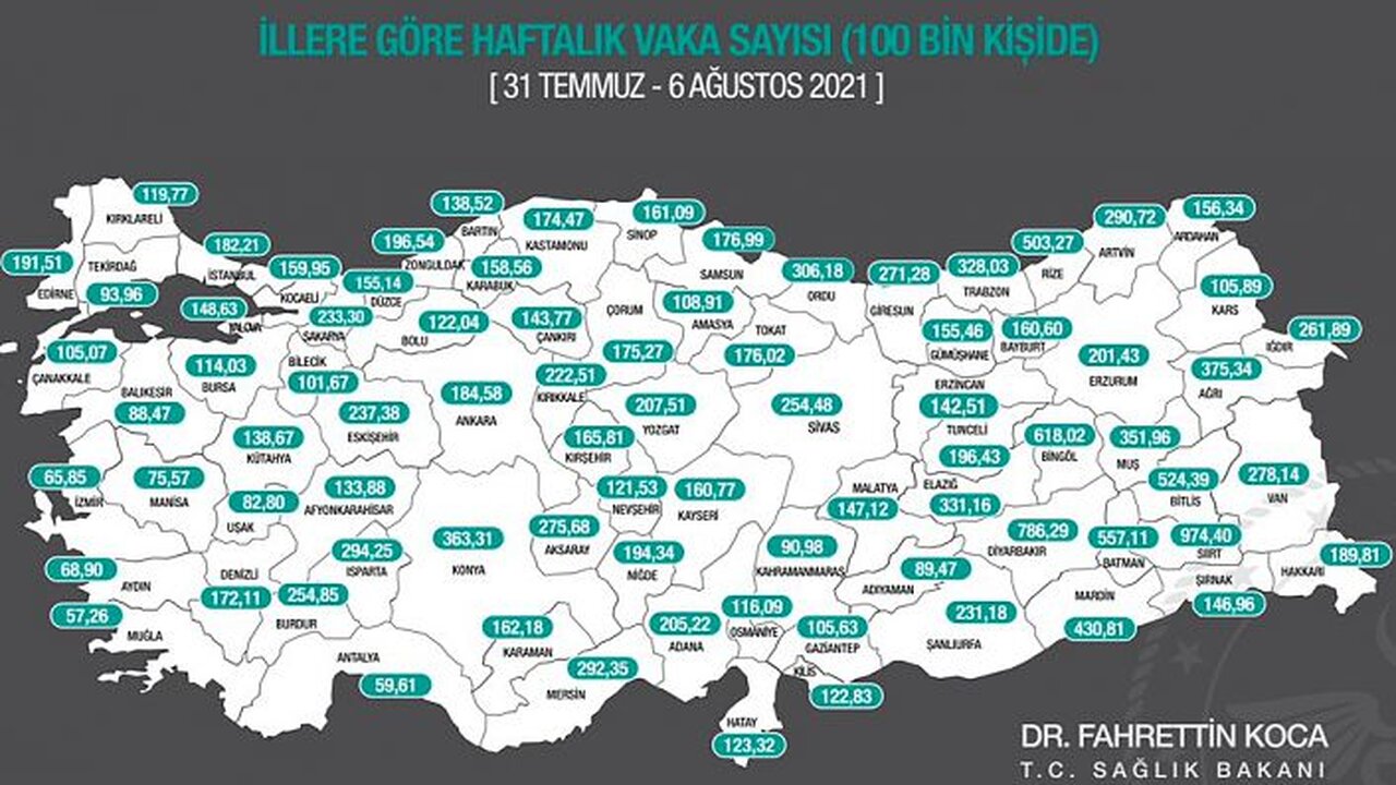 İşte 31 Temmuz-6 Ağustos 2021 tarihleri arasındaki illere göre haftalık vaka sayısı (100 binde):