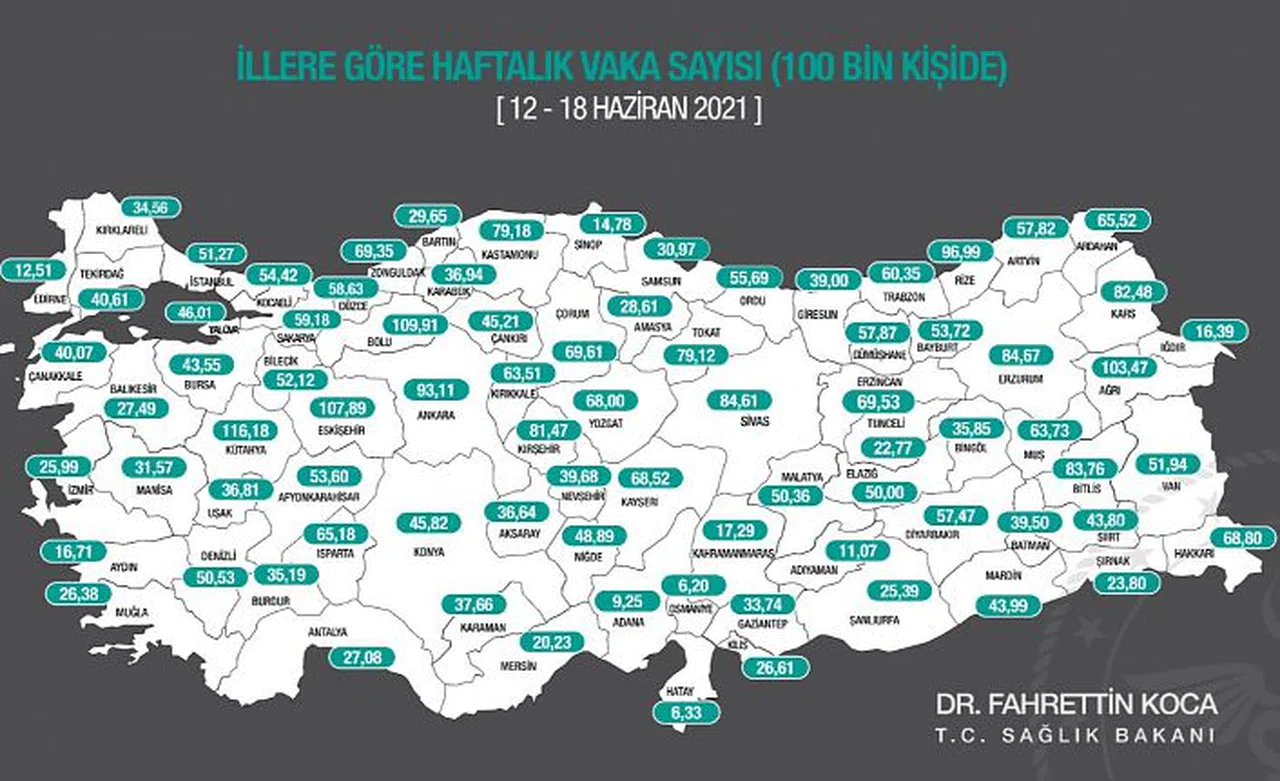 İşte İllere Göre Haftalık Vaka Sayısı (100 binde) (12-18 Haziran 2021) en çoktan aza doğru sıralaması: