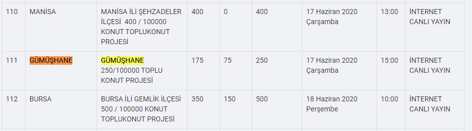 Daha önce 5 Mayıs'ta yapılacağı duyurulan kura töreleri küresel bir salgın haline gelen Koronavirüse karşı alınan ve alınacak tedbirler kapsamında vatandaşların sağlığını korumak için iptal edilerek internet üzerinden canlı yayınla gerçekleştirilecek. Buna göre Gümüşhane'de konutların kurası 17 Haziran Çarşamba günü saat 15.00'da çekilecek.