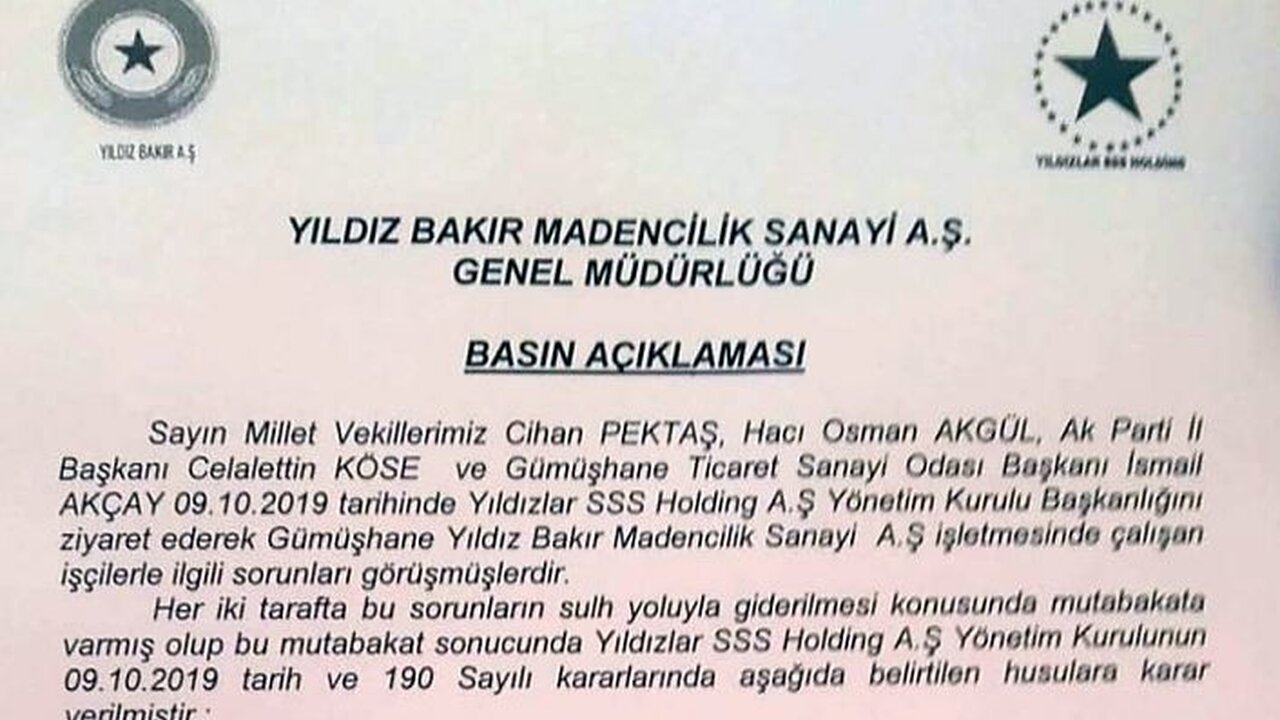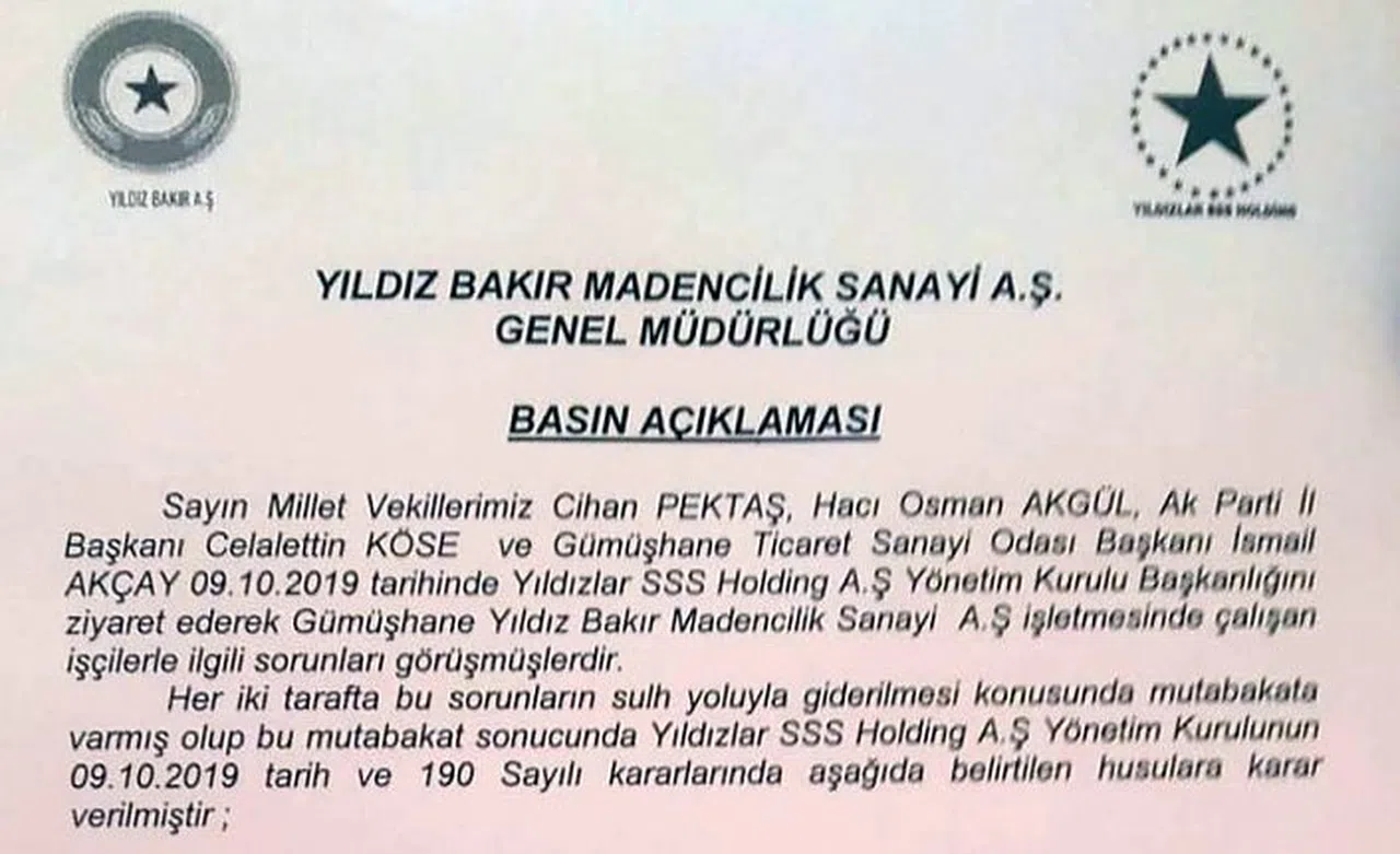 Yıldız Bakır Madencilik Sanayi A.Ş. Genel Müdürü Muktedirbillah Sakin imzasıyla yayımlanan açıklamada AK Parti Gümüşhane Milletvekilleri Hacı Osman Akgül, Cihan Pektaş, AK Parti İl Başkanı Av.Celalettin Köse, Gümüşhane Ticaret ve Sanayi Odası Başkanı İsmail Akçay'ın 9 Ekim tarihinde Yıldızlar SSS Holding A.Ş. Yönetim Kurulu Başkanlığını ziyaret ederek Gümüşhane Yıldız Bakır Madencilik A.Ş. işletmesinde çalışan işçilerle ilgili sorunları görüştükleri kaydedildi.